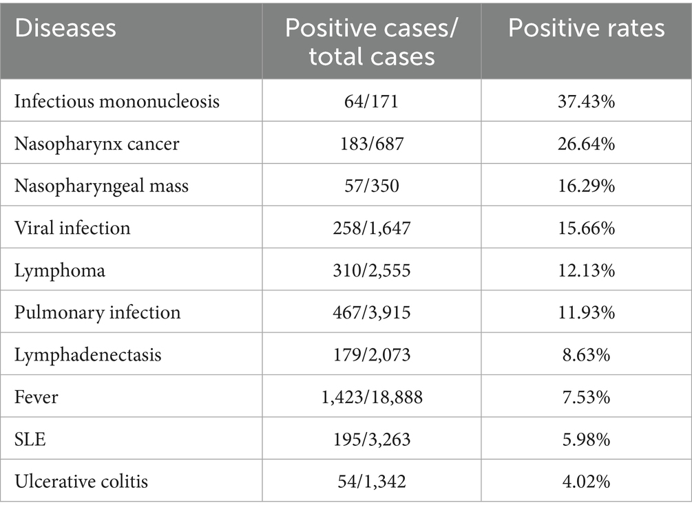 Numerous studies have shown that (Wang et al., 2016), (Cohen, 2000; Macsween and Crawford, 2003; Vereide et al., 2014), EBV infection is associated with IM, NPC, lymphoma, and other diseases. In this study, the EBV DNA positivity rates of 10 EBV-associated diseases were primarily analyzed. The top three highest positive rates of EBV DNA are IM, NPC, and nasopharyngeal masses. IM is a major clinical syndrome caused by primary EBV infection, with a typical clinical “triad” of fever, pharyngitis, and cervical lymph node enlargement, which may be accompanied by hepatosplenomegaly, and a typical peripheral blood picture characterized by an increase in lymphocytes and atypical lymphocytes (Chinese Medical Association Pediatrics Branch Infection Study Group and National Children’s EB Virus Infection Collaborative Group, 2021). Current research confirms that the clinical manifestations of IM are diverse and nonspecific, which may lead to diagnostic challenges, resulting in frequent misdiagnosis or underdiagnosis and, consequently, delayed or missed therapeutic intervention (Wang et al., 2019).