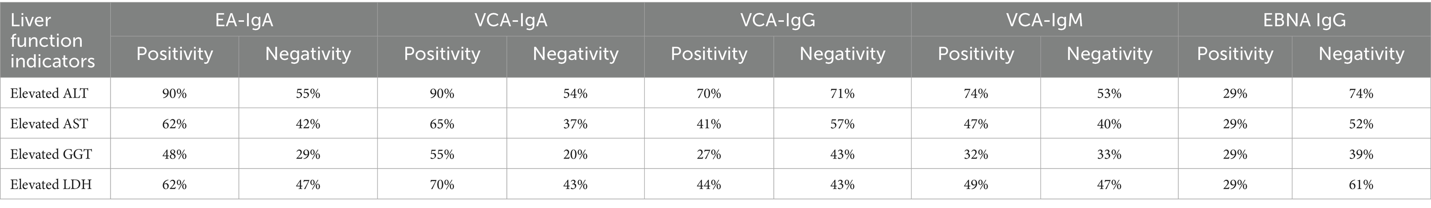 This study analyzed 152 patients diagnosed with IM. Among patients who tested positive for both EA-IgA and VCA-IgA, the incidence of elevated ALT was highest, with 90% of individuals in this group exhibiting abnormal ALT levels. This suggests that EBV-specific antibody profiles may be associated with liver function parameters, particularly EA-IgA and VCA-IgA (Table 2).