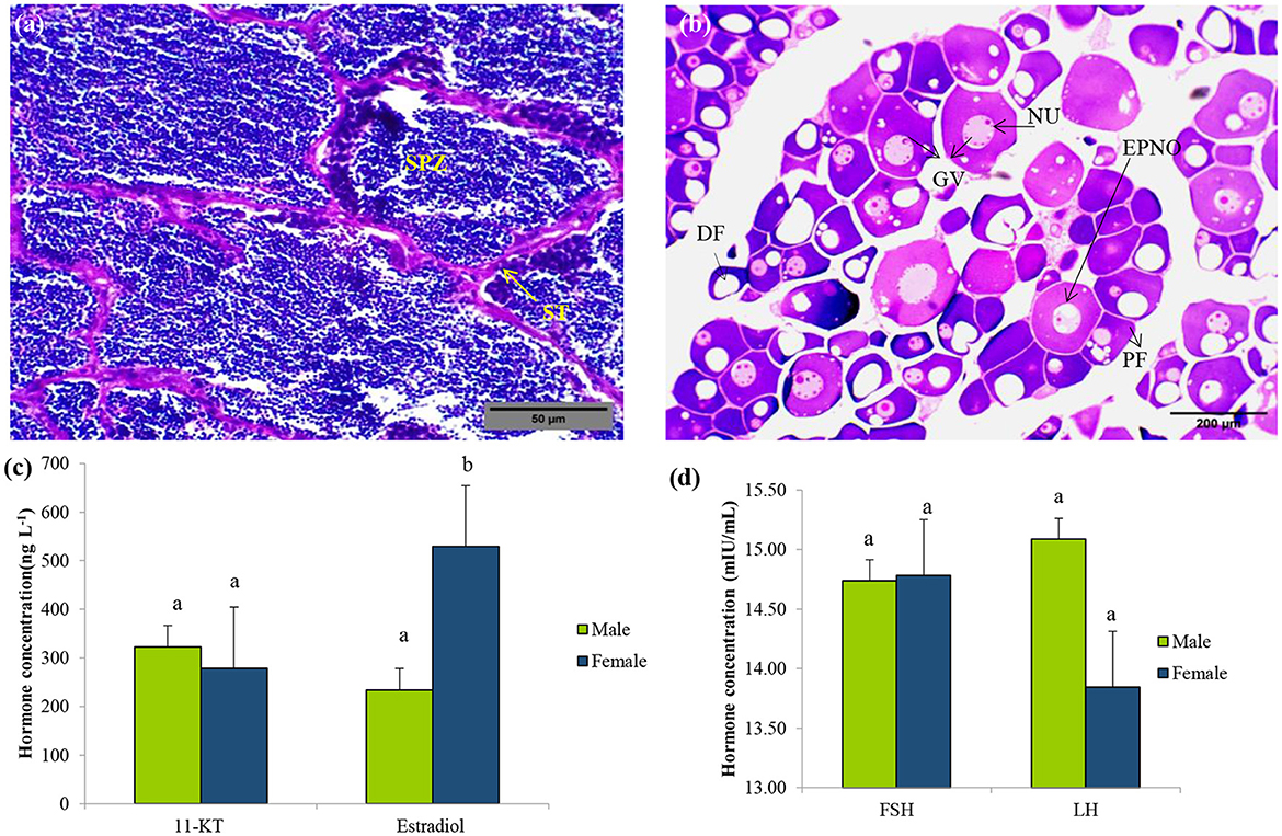 Figure 1. Sex identification of L. catla during the pre-spawning reproductive cycle. Representative histology graphs from testis (a) and ovary (b) of L. catla with the scale bar 500 μm and 200 μm, respectively. Serum concentrations of 11-Ketotestosterone (11-KT) and estradiol (c), follicle-stimulating hormone (FSH), and luteinizing hormone (LH) (d) in male and female L. catla. Values are mean ± SEM. Different letters represent a significant difference at one-way Anova, p-value < 0.05. SPZ, spermatazoa; ST, Seminiferous tubules; DF, Developing follicle; NU, nucleolus; GV, germinal vesicle; PF, previtellogenic follicles; EPNO, early perinucleolar oocyte.