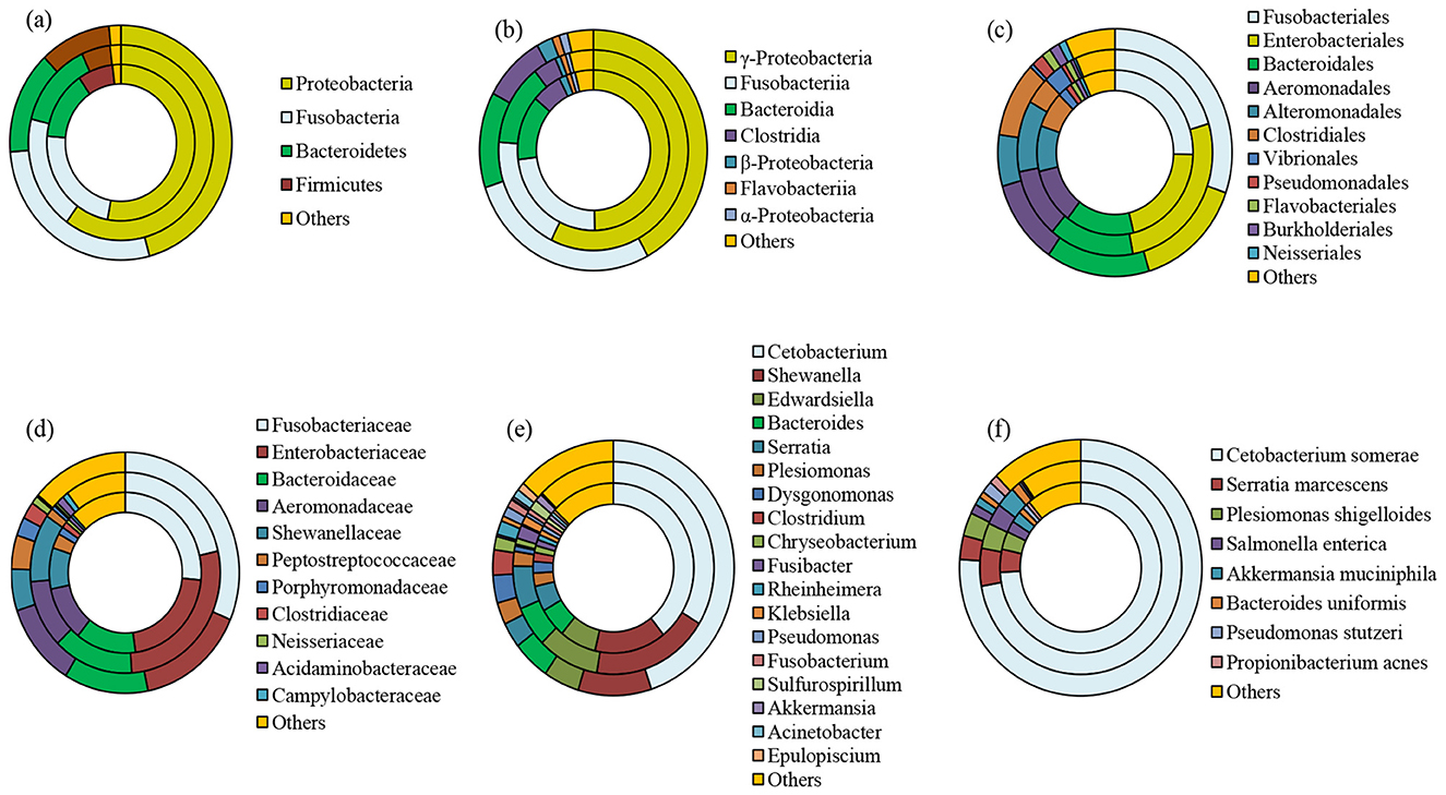 Figure 2. Taxonomic composition of whole, male, and female bacterial communities at phylum (a), class (b), order (c), family (d), genus (e), and species (f) level obtained from L. catla gut samples. The category “others” accounted for taxa that were represented by < 1% abundance. Innermost circle represents the bacterial composition of entire catla gut (CGtotal); Middle circle: female catla gut (CGF); Outer circle: male catla gut (CGM).