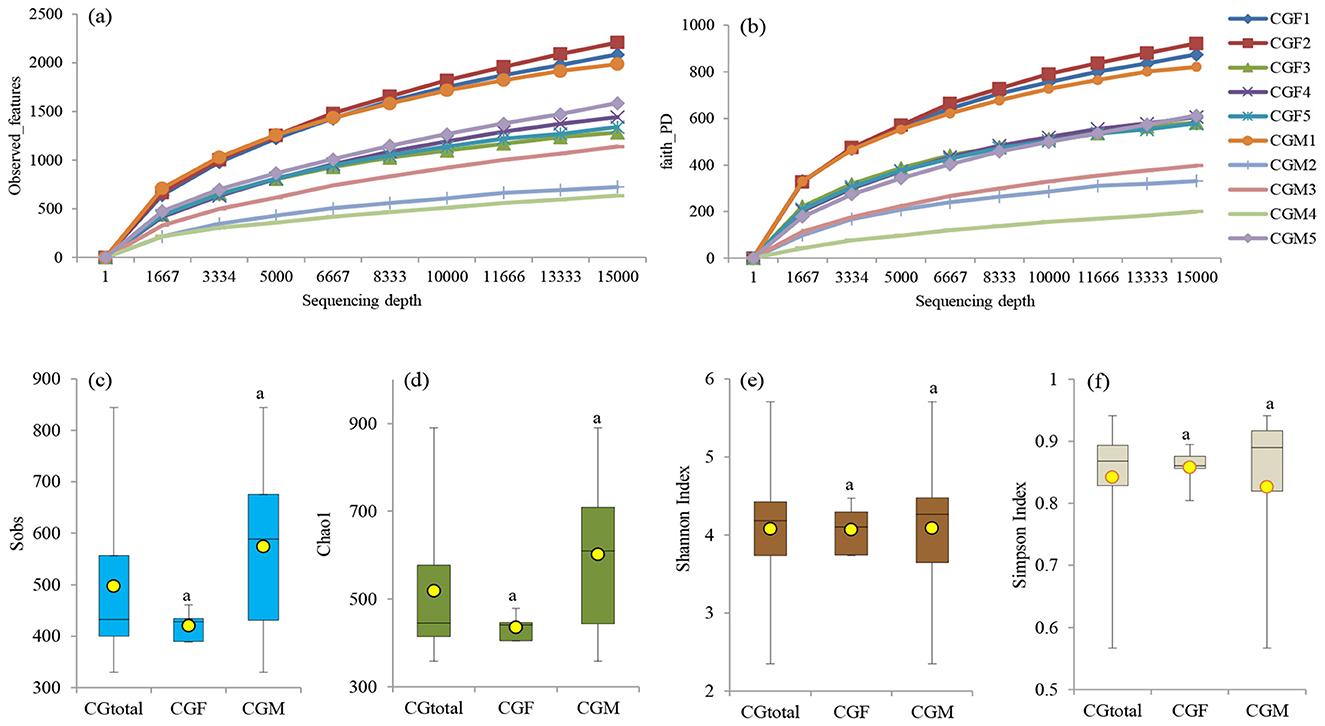 Figure 3. Rarefaction plots illustrating observed features (a) and Faith's PD (b) at different sequencing depths for individual samples. α-diversity metrics, such as sobs (c), chao1 (d), shannon (e), and simpson (f), are depicted for the entire gut microbiome (CGtotal) as well as the female (CGF) and male (CGM) groups of L. catla. Means with the same letter indicate non-significant differences (ANOVA, p-value > 0.05).