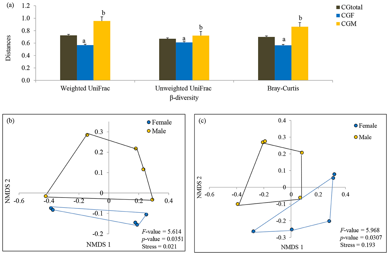 Figure 4. Comparison of phylogenetic (weighted and unweighted UniFrac distances) and taxonomic (Bray-Curtis distances) β-diversity of male and female L. catla gut taxa (a). Comparison of gut microbial communities between male and female L. catla using NMDS based on weighted UniFrac distances (b) and Bray-Curtis distances (c). Multivariate analysis of variance (MANOVA) was used to test significant differences in these two distinct sex-specific groups using PAST (v.3.18) program.