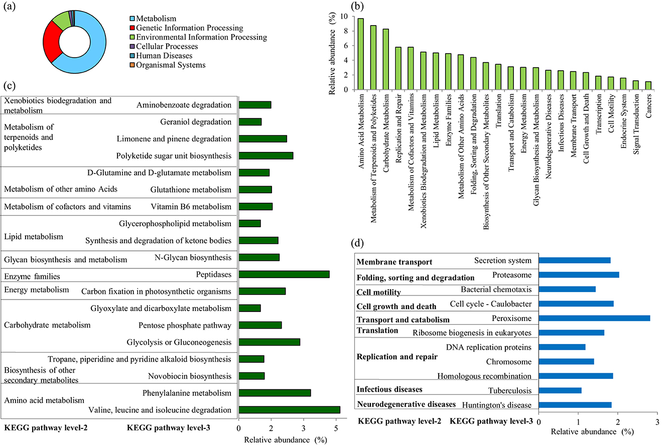 The study found that at KEGG level-3, the relative abundances of genes linked with various metabolic pathways were particularly prominent (Figure 5C). These pathways included valine, leucine, and isoleucine degradation, peptidases, phenylalanine metabolism, glycolysis/gluconeogenesis, polyketide sugar unit biosynthesis, limonene and pinene degradation, carbon fixation in photosynthetic organisms, pentose phosphate pathway, N-glycan biosynthesis, synthesis and degradation of ketone bodies, vitamin B6 metabolism, glutathione metabolism, aminobenzoate degradation, D-glutamine and D-glutamate metabolism, novobiocin biosynthesis, tropane, piperidine, and pyridine alkaloid biosynthesis, geraniol degradation, glycerophospholipid metabolism, glyoxylate and dicarboxylate metabolism. Moreover, this study revealed a dominance of relative gene abundances in various pathways, including those related to genetic information processing (such as proteasome, ribosome biogenesis in eukaryotes, homologous recombination, chromosome, and DNA replication proteins), environmental information processing (secretion system), cellular processes (peroxisome, cell cycle in Caulobacter, bacterial chemotaxis), as well as genes associated with human diseases (Huntington's disease and tuberculosis) (Figure 5D).