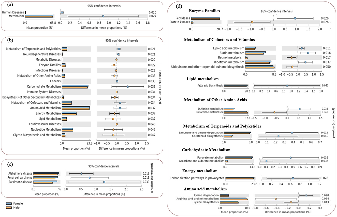 Figure 6. STAMP plots of PICRUSt to infer differential functions of the L. catla male and female gut bacterial communities (n = 10). KEGG Level 1 includes all pathways (a), Level 2 includes metabolic and human disease related pathways (b), and Level-3 includes all the significant features within the human disease (c) and metabolic pathways (d). Significant p-values < 0.05 were generated by Welch's t-test.