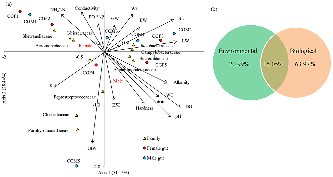 Figure 7. Canonical correspondence analysis (CCA) demonstrates the correlation between the bacterial compositions of two different male and female guts and their basic environmental and biological parameters at the family level (a). The arrow direction of the vectors denotes the maximum change direction for a variable, and the length of each vector serves as a measure of how well the variable elucidates the data distribution. Positive correlation between the variables is depicted by long arrows in the same direction, negative correlation by arrows in opposite directions, and no correlation by perpendicular arrows. The perpendicular arrows are indicative of no correlation. VPA provided the relative contribution of environmental and biological factors in causing the variation in the L. catla gut bacterial taxa (b). SL, standard length; Wt, Body weight; GW, gonad weight; LW, liver weight; GtW, gut weight; EW, Eviscerated weight; GSI, gonadosomatic index; HIS, hepatosomatic index; K, fatness; WT, water temperature; N, nitrite-nitrogen, -N, ammonia-nitrogen, P, dissolved orthophosphate; DO, dissolved oxygen.