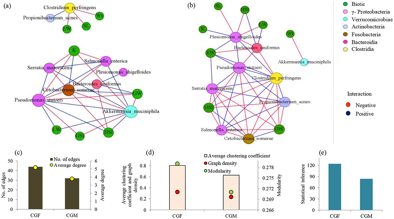 Figure 8. Co-occurrence networks of abundant bacterial species (>1% relative abundance) in L. catla gut: male (a) and female (b) groups in relation to biotic factors. Node size is proportional to species connectivity (degree), with different colors representing bacterial classes and biotic variables. Edges represent a significant correlation between two species (Pearson's |r| > 0.7, p-value < 0.01), with red showing negative and blue showing positive interactions. Network topological features of gut bacterial communities of L. catla, such as edges, average degree (c), average clustering coefficient, graph density, modularity (d), and statistical inference (e). Wt, Body weight; SL, standard length; GW, gonad weight; LW, liver weight; GtW, gut weight; EW, Eviscerated weight; GSI, gonadosomatic index; HSI, hepatosomatic index; K, fatness; CGF, female gut bacterial group; CGM, male gut bacterial group.