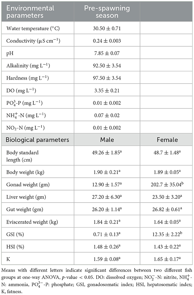 Surface water samples were collected once at the time of fish sampling from two rearing ponds at ICAR-CIFA to avoid any temporal bias. Using a sterile plastic bottle, three independent water samples were collected from each pond to provide biological replicates for physico-chemical analysis. Environmental parameters, e.g., water temperature, pH, conductivity, alkalinity, hardness, dissolved oxygen (DO), phosphate (-P), ammonia (-N), and nitrite (-N) in each rearing pond were assessed following the method outlined by Leoni et al. (2018). Body weight (Wt), standard length (SL), gonad weight (GW), liver weight (LW), and gut weight (GtW) were measured for both male and female fish. Eviscerated weight (EW) (i.e., whole fish excluding the gonad, liver, and gut tissue) was calculated. Moreover, additional bioenergetic indices were computed to evaluate the fish's condition. Gonadosomatic index (GSI) expressed as 100 × GW/EW served as a marker for fish reproductive cycles. Hepatosomatic index (HSI) was calculated as 100 × LW/EW which provided insights into liver function and metabolic health, and fatness (K) was determined as 100 × W/L3 offering an indicator of adiposity and overall fish condition. These indices together offer valuable insights into the reproductive dynamics as well as the physiological state of the fish species under investigation.