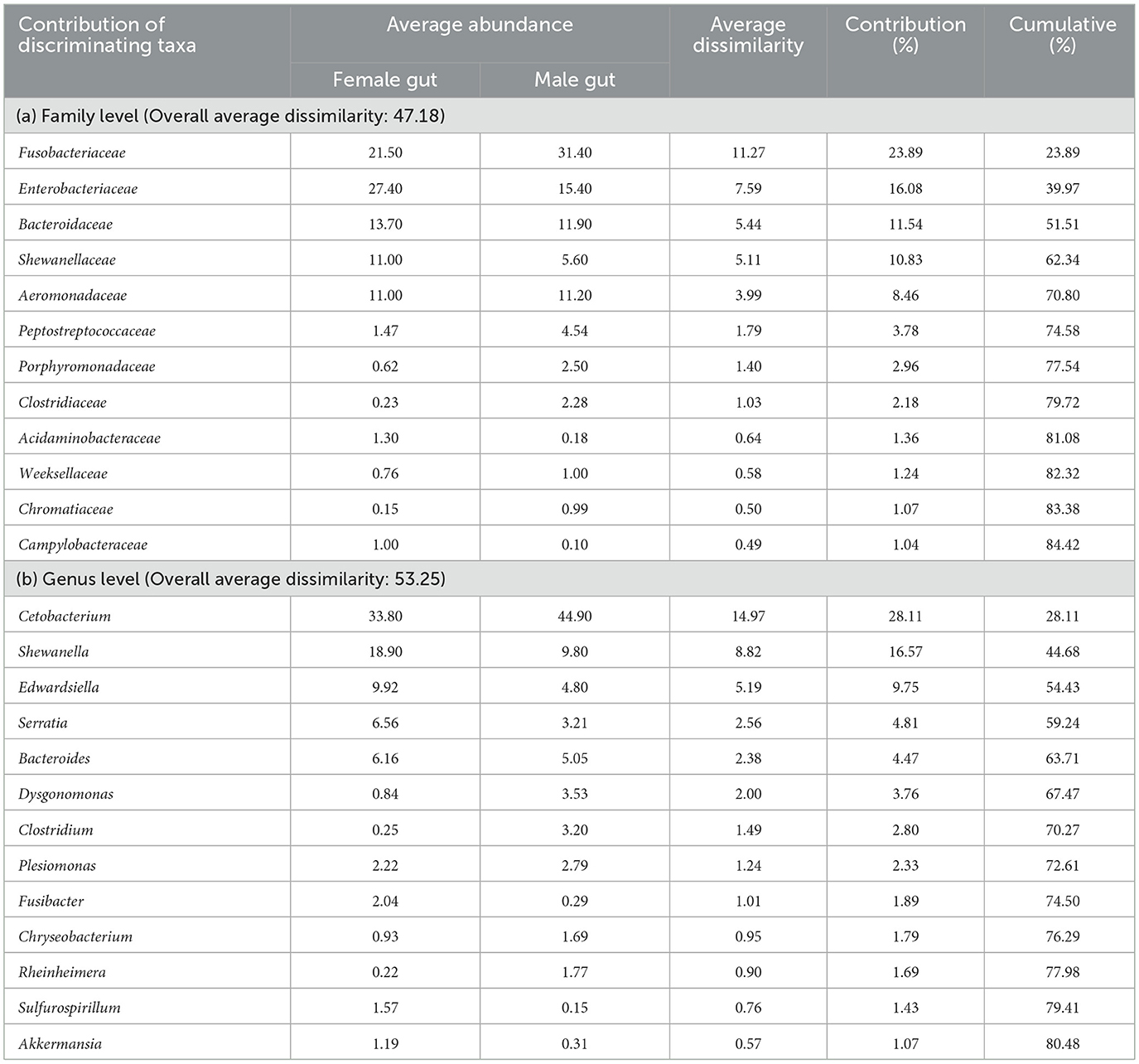 Through SIMPER analysis, the investigation of taxa exhibiting the most substantial variations in relative abundance between two distinct sex-specific groups was conducted. The findings emphasized that families such as Fusobacteriaceae, Enterobacteriaceae, Bacteroidaceae, Shewanellaceae, Aeromonadaceae, Peptostreptococcaceae, Porphyromonadaceae, Clostridiaceae, Acidaminobacteraceae, Weeksellaceae, Chromatiaceae and Campylobacteraceae were the primary contributors (>80%) to the observed structural distinctions in gut microbial communities between males and females (Table 2). Within the genus, Cetobacterium, Shewanella, Edwardsiella, Serratia, Bacteroides, Dysgonomonas, Clostridium, etc. differed significantly by 53.25% between male and female catla guts.