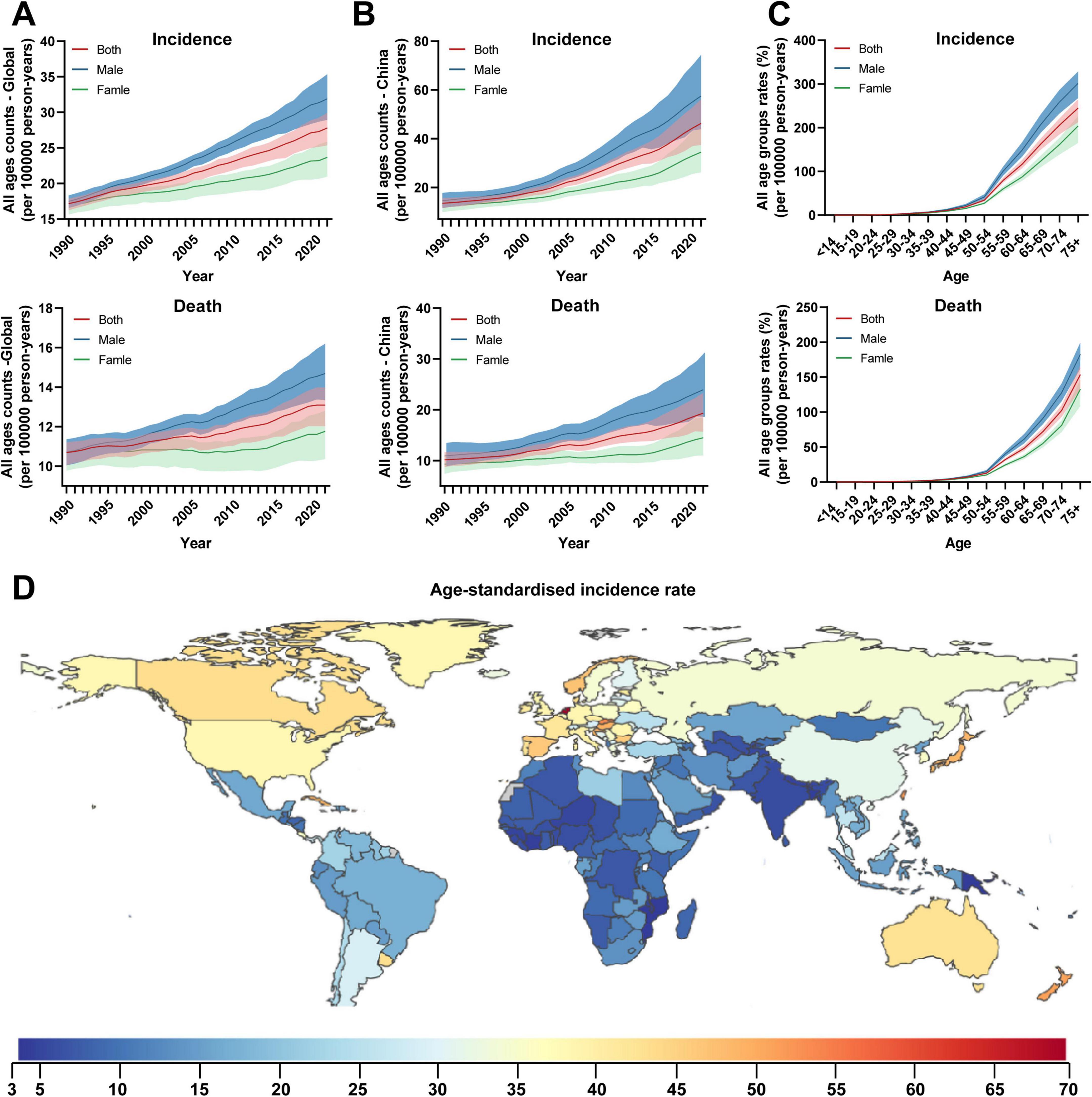 Figure 1. Global temporal patterns of colorectal cancer burden, 1990–2021. (A) All-age counts. The global annual number of newly diagnosed CRC cases exceeds one million and shows an upward trend; (B) Age-standardized rates. In China, the number of newly diagnosed cases reached 517,100 in 2022; (C) All age groups rates in 2021. (D) Geographical distribution of age-standardized rates of colorectal cancer in 2021. Data source: Global Burden of Diseases, Injuries, and Risk Factors Study 2024 (Institute for Health Metrics and Evaluation, 2024).