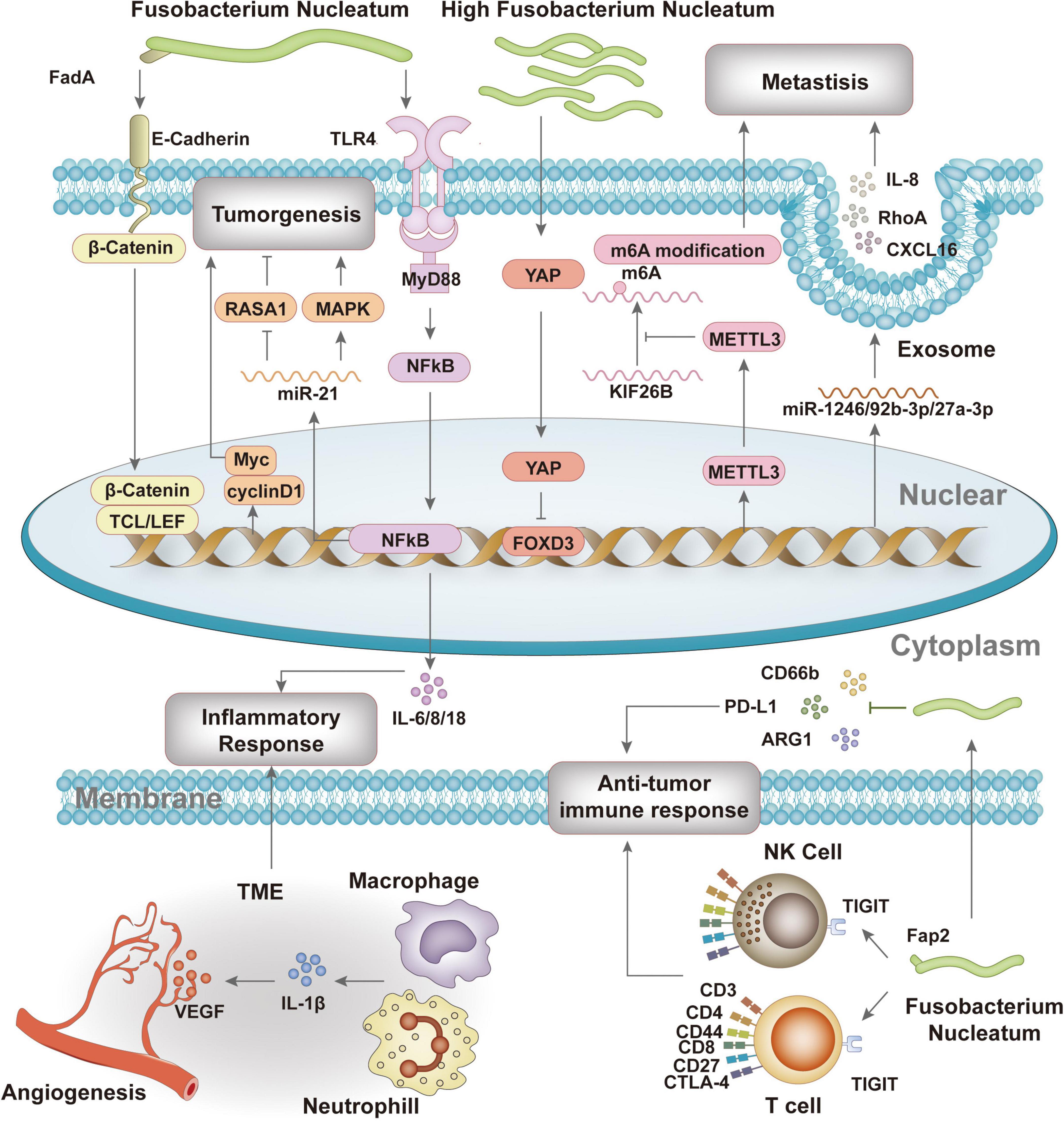 F. nucleatum promotes CRC progression through dual mechanisms: (1) F. nucleatum mediates signaling pathways, including the FadA/E-cadherin/β-catenin regulatory axis and METTL3/m6A modification, to regulate CRC proliferation and invasion capabilities, thereby directly influencing CRC progression; (2) F. nucleatum induces the production of pro-inflammatory factors such as NF-κB, IL-6, and IL-8 while modulating PD-L1 expression to affect inflammatory and anti-tumor immune responses, thereby indirectly regulating CRC progression.