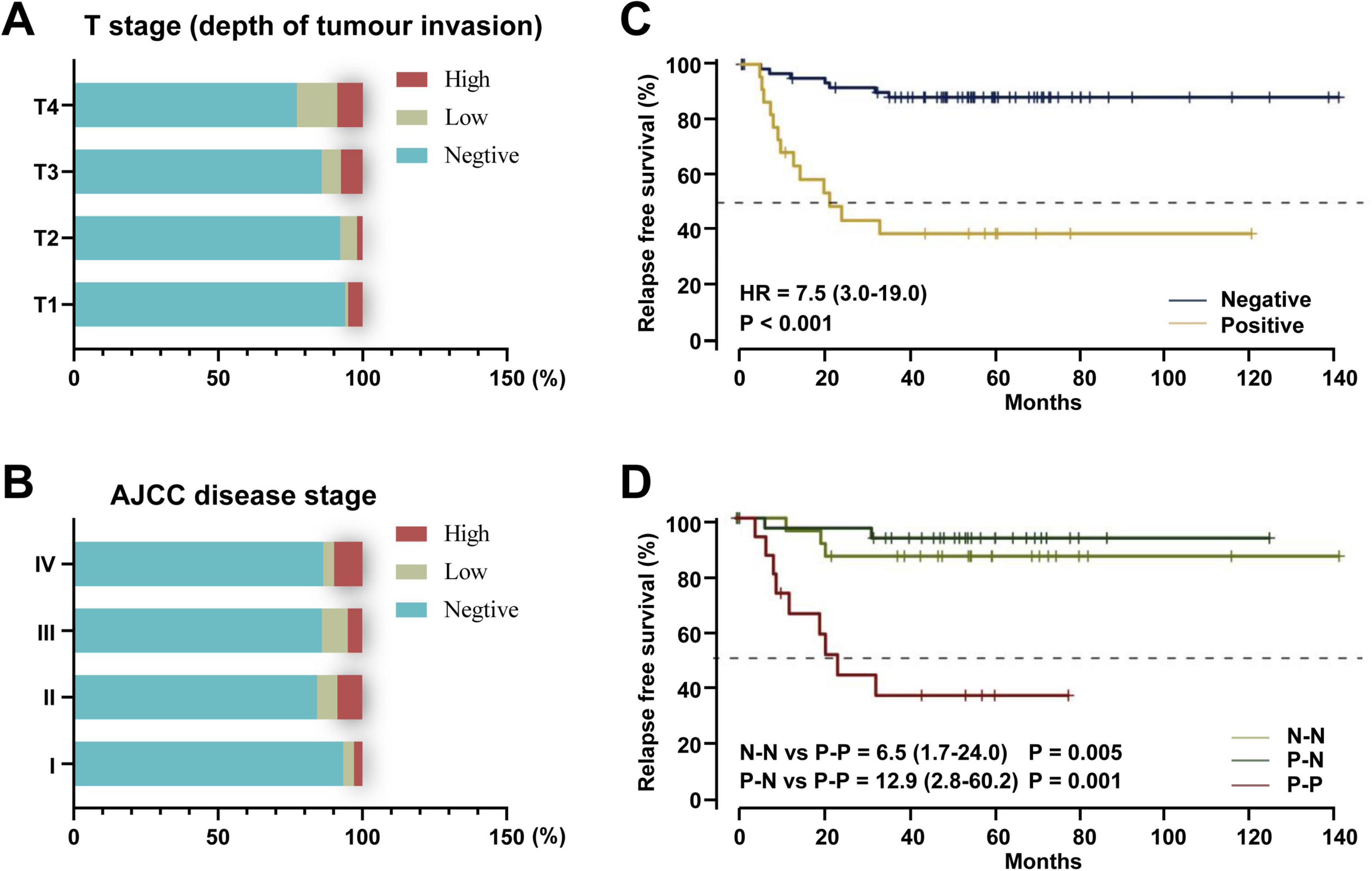 Figure 4. The role of F. nucleatum in the prognostic evaluation of colorectal cancer. (A) F. nucleatum detection by tumor infiltration depth (T1, submucosa; pT2, muscularis propria; T3, subserosa; T4, serosa or other organs). (B) F. nucleatum detection by AJCC disease stage (Mima et al., 2016). (C) Treated cohort by F. nucleatum status in post-nCRT tumor samples. (D) Paired treated cohort grouped according to the shift in F. nucleatum status between pre-nCRT and post-nCRT paired samples. N-N: patients who maintained negative F. nucleatum status before and after treatment. P-N: patients in whom F. nucleatum was negative after treatment. P-P: patients with a positive F. nucleatum status in both samples (Serna et al., 2020). HR: hazard ratio.