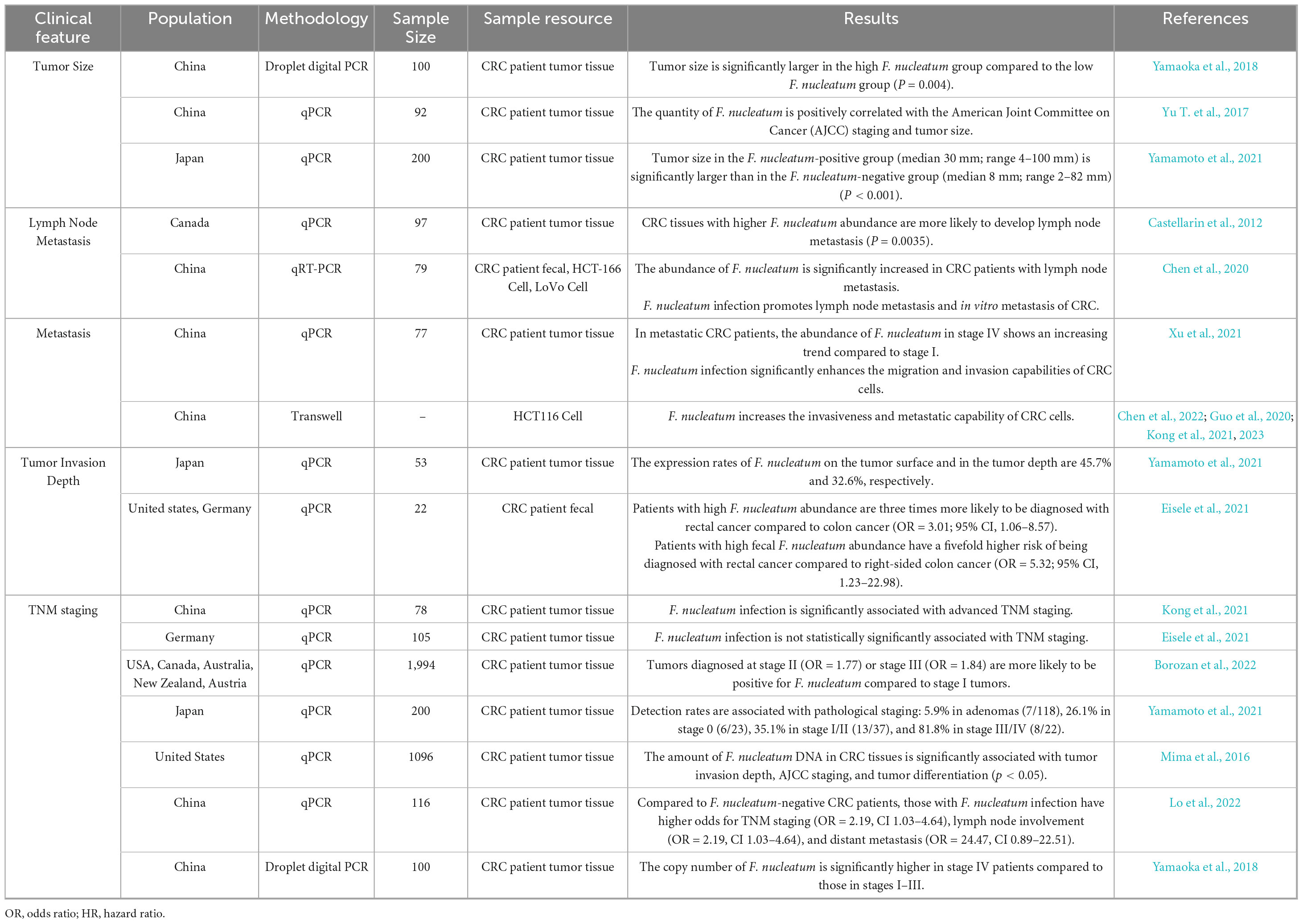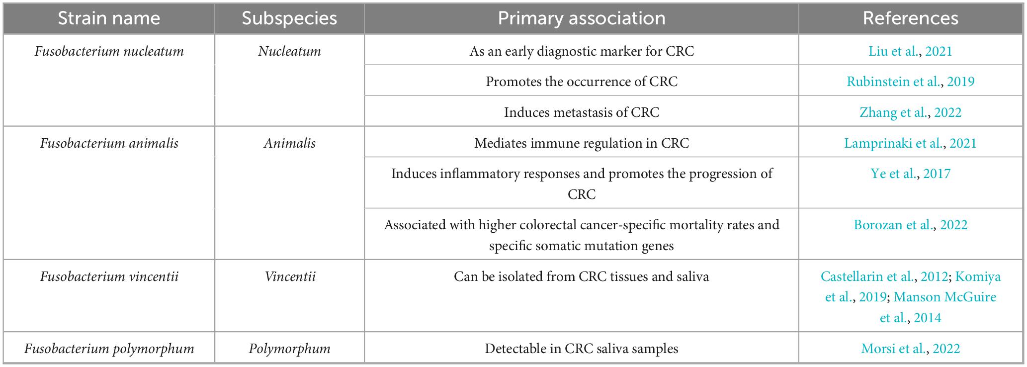 F. nucleatum belongs to the family Fusobacteriaceae. This bacterium is anaerobic but can still grow in environments with oxygen levels up to 6% (Bolstad et al., 1996). Early observations in the human oral cavity identified fusiform microorganisms, and the Fusobacterium genus was isolated based on sensitivity to dyes and antibiotics (Baird-Parker, 1957). Active strains that ferment amino acids, produce acetate and butyrate, and exhibit limited sugar-degrading activity are classified as F. nucleatum (Yu et al., 2022). Subsequent studies on 16S genomics have suggested that the common ancestor of Fusobacterium was Leptotrichia, which underwent adaptive radiation during evolution, diverging into three main lineages and five major clades (Manson McGuire et al., 2014). Based on 16S rRNA gene sequence analysis, it can be further classified into four subspecies: nucleatum, animalis, vincentii (including fusiforme), and polymorphum (Nie et al., 2015). These subspecies have been found in clinical tissues and fecal samples of patients with CRC, with a significant increase in F. nucleatum (Bi et al., 2022; Table 1).