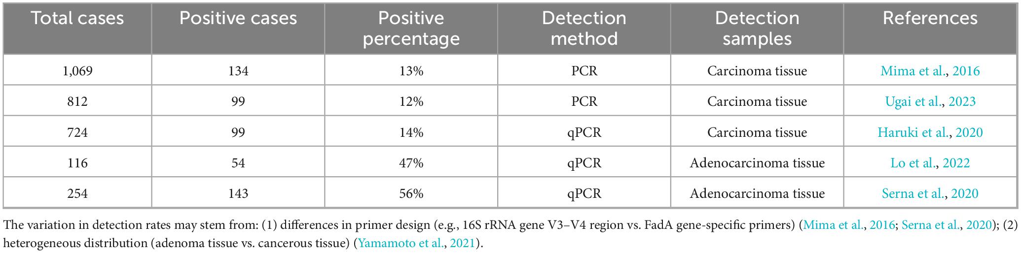 Detection rates of F. nucleatum in CRC tissues vary across studies (Table 2). The variability in detection rates of colonic adenomas and colorectal cancers may stem from differences in microbiota colonization sites and primer specificity. During colorectal cancer progression, F. nucleatum exhibits heterogeneous distribution, with significantly higher abundance in superficial regions compared to deep regions, leading to differences in detection rates between colonic adenomas and CRC tissues (Yamamoto et al., 2021). Additionally, primers targeting the FadA adhesin gene (e.g., those used in Yamamoto et al., 2021) demonstrate 2.3-fold higher sensitivity than universal 16S rRNA primers, explaining discrepancies among studies (OR = 3.82, 95% CI 1.25–11.7). qPCR can also detect F. nucleatum in fecal samples, enabling non-invasive detection (Tunsjø et al., 2019). Fecal metagenomic analysis has identified gene markers for CRC, including two validated by qPCR in an independent CRC patient cohort, highlighting the potential for early-stage CRC diagnosis (Yu J. et al., 2017). In a study on cancer-related fecal microbial markers, F. nucleatum showed a specificity of 76.9%, a sensitivity of 69.2%, and an ROC of 0.737 for predicting CRC (Eklöf et al., 2017).