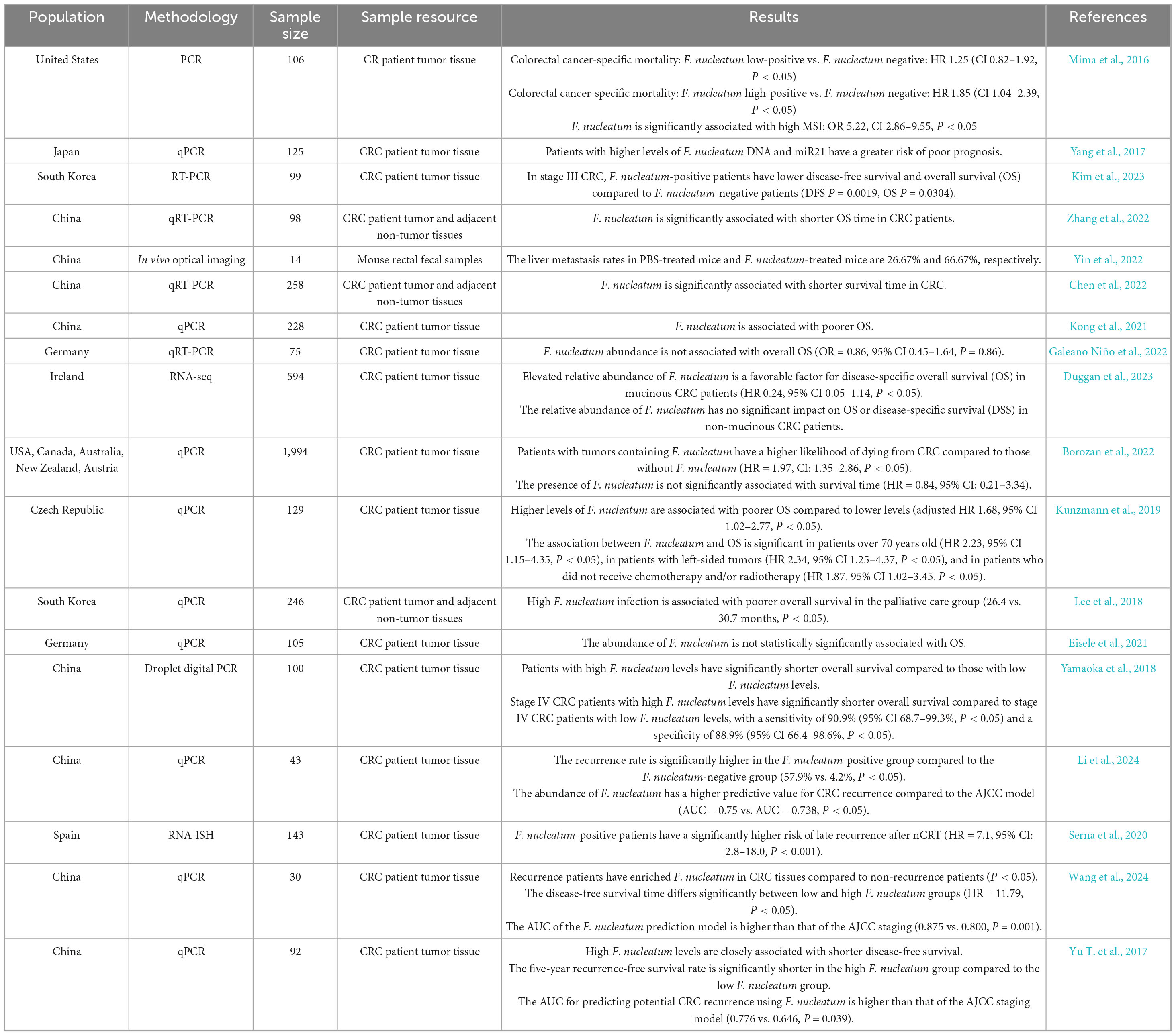 CRC, colorectal cancer; F. nucleatum, Fusobacterium nucleatum; FIT, immunochemical test; qPCR, quantitative polymerase chain reaction; PCR, polymerase chain reaction; FISH, fluorescence in situ hybridization; AJCC, American Joint Committee on Cancer; OR, odds ratio; HR: hazard ratio.