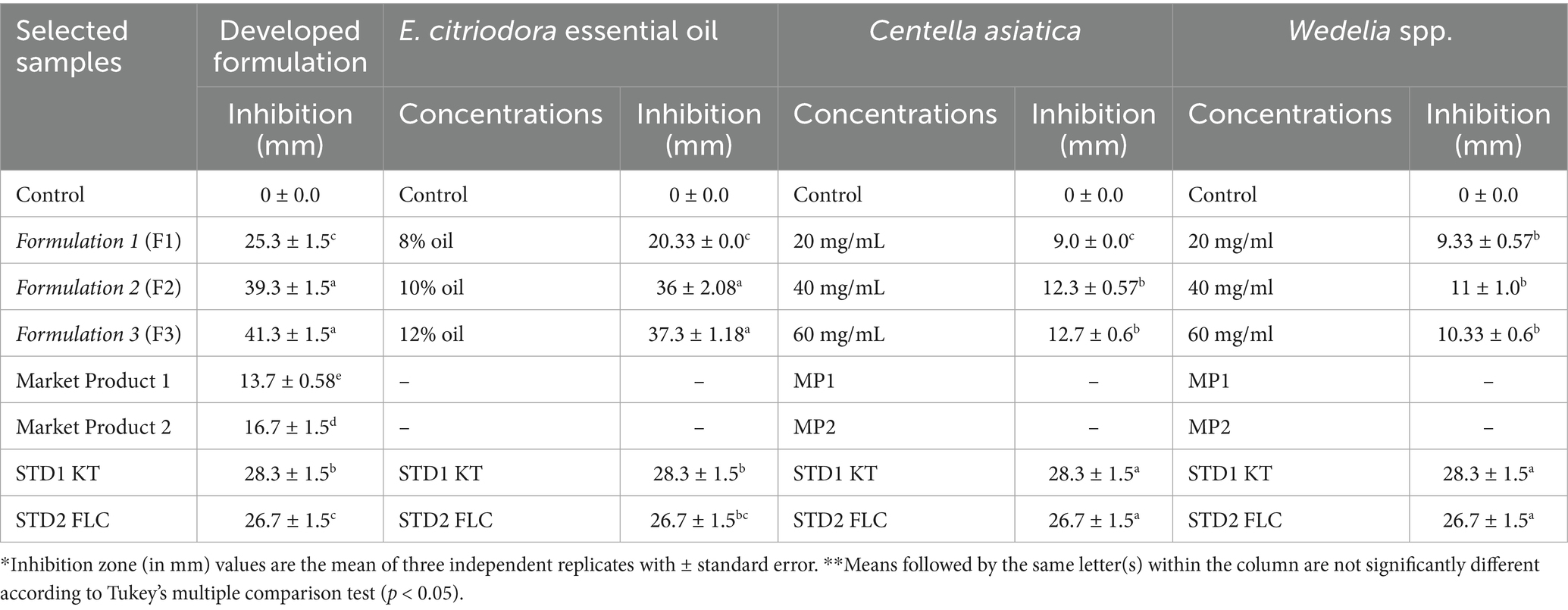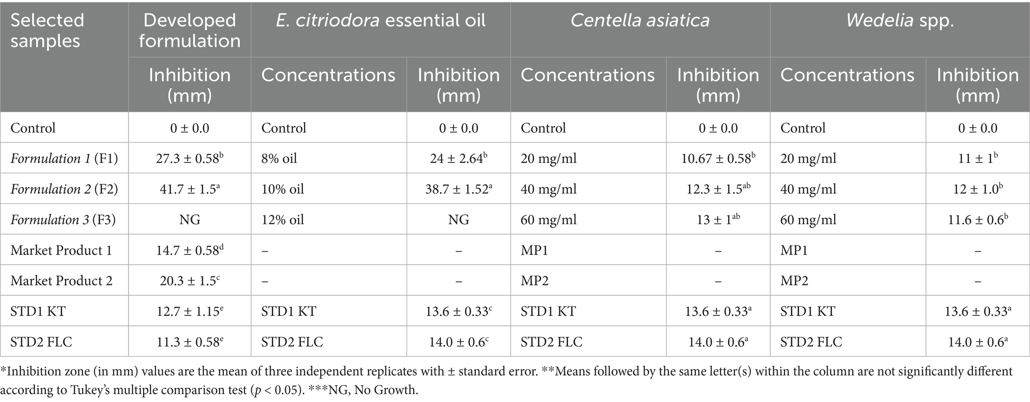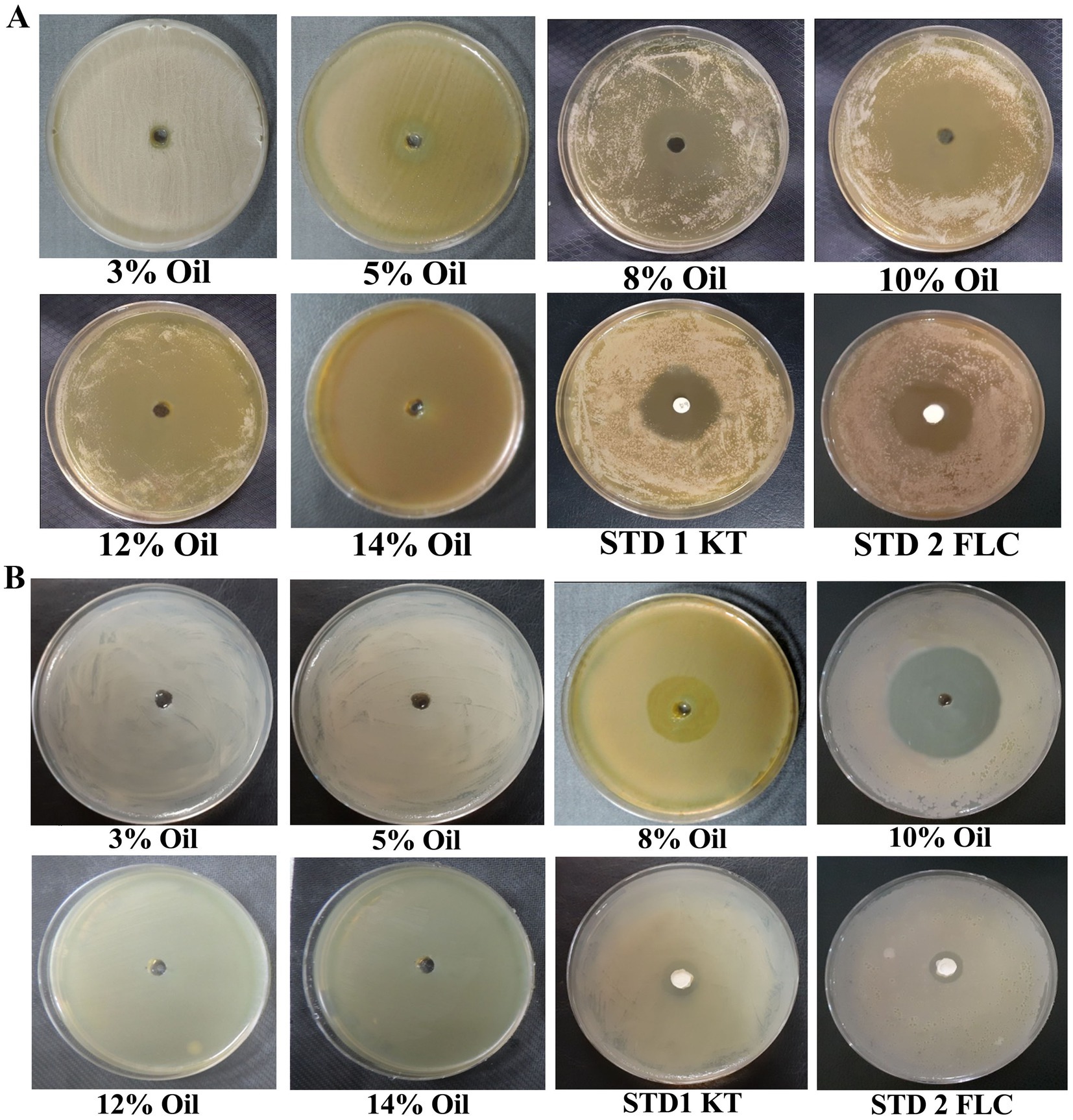 The antifungal efficacy of the formulated oil, comprising a blend of the three herbal components, was similarly assessed using the agar well diffusion assay. In addition, different strategic experiments were executed to further examine the efficacy of the different combinations of the formulated oil.