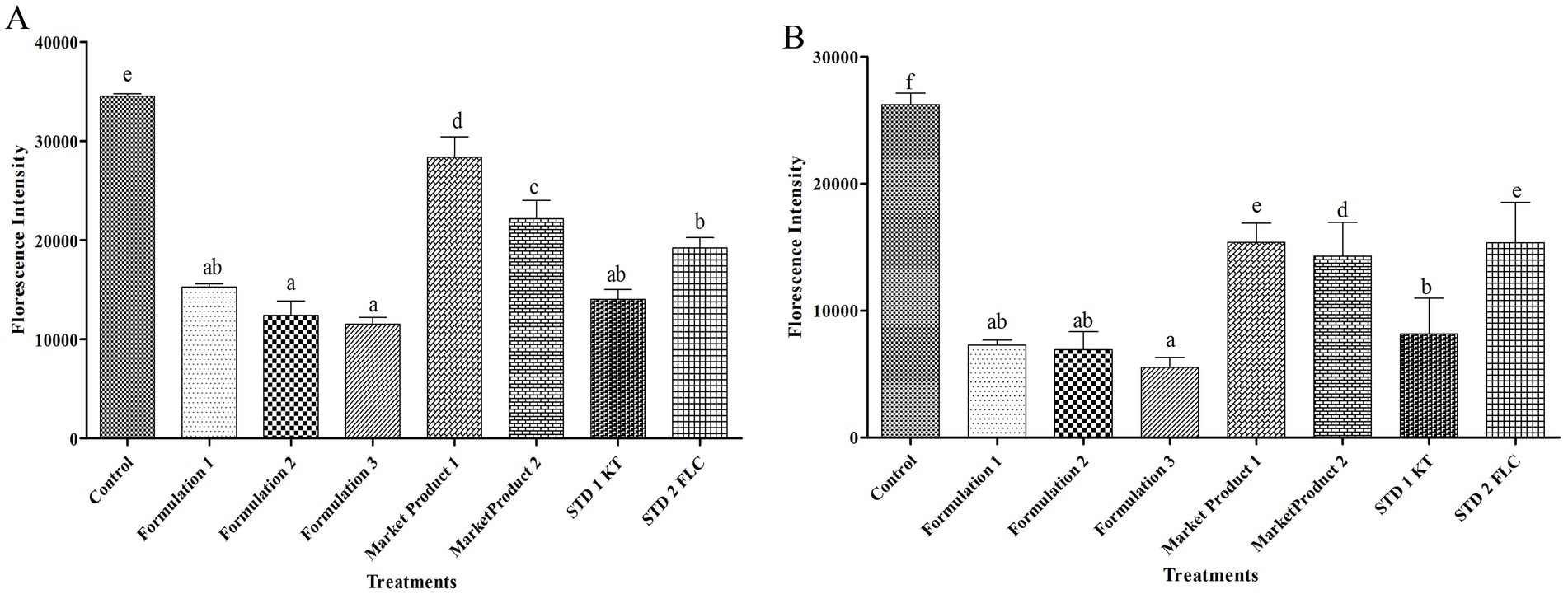 Bar graphs labeled A and B compare fluorescence intensity for various treatments, including Control, Formulation 1, Formulation 2, Formulation 3, Market Product 1, Market Product 2, STD 1 KT, and STD 2 FLC. Group A shows the Control with the highest intensity, decreasing across other treatments. Group B shows a similar pattern, with the highest intensity in the Control. Each bar is marked with letters indicating statistical significance: a, ab, b, c, d, e, and f.