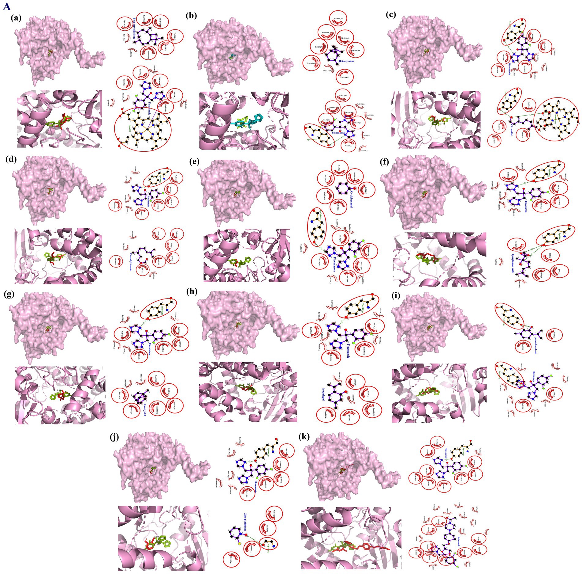 Figure 3. Molecular interactions between lansterol-14α-demethylase (a component of the M. furfur cell wall; PDB ID: 4WMZ) and phytomolecules from EC oil, investigated by molecular docking. The figures depict the surface view of the ligand-binding site overlaid with the co-crystalized ligand and highlight their shared interactions within red circles. In this figure (a) β-caryophyllene; (b) β-pinene; (c) Citronellol; (d) Citronellyl formate; (e) Cyclohexanol; (f) Epoxylinalool oxide; (g) Eucalyptol; (h) Isopulegol; (i) p-menthan-3-one; (j) Zinc pyrithione; (k) Ketoconazole.