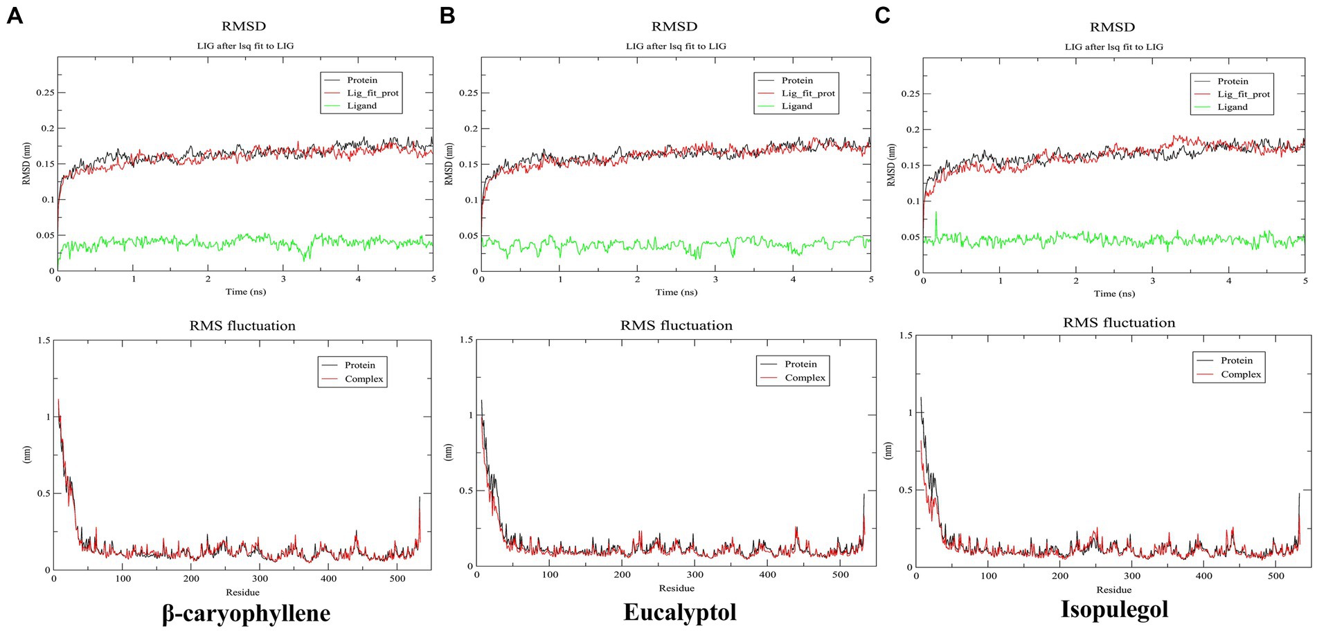 Figure 4. Root mean square deviation (RMSD) and root mean square fluctuation (RMSF) of β-caryophyllene (A), eucalyptol (B), and isopulegol (C).