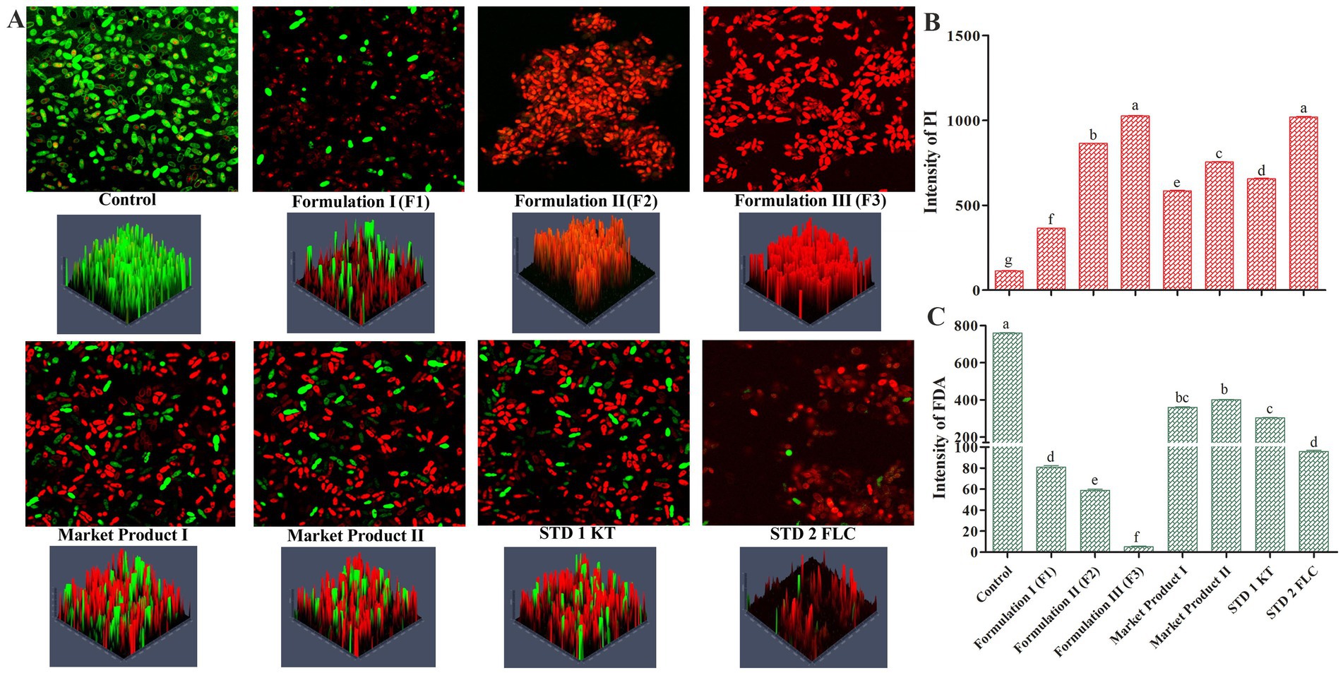 A rapid, double-staining procedure using fluorescein diacetate (FDA) and propidium iodide (PI) was applied to confirm the antimicrobial activity of the developed formulation through the determination of cell viability in cell suspensions (Zhu et al., 2023). Treated cells of dandruff-causing organisms were harvested from different treatments and incubated with a mixture of FDA (2 mg/mL) and PI (1 mg/mL). The stained cells were washed aseptically using PBS (pH 7.0). The viability of live and dead cells after the supplementation of the formulated product was visualized using a confocal laser scanning microscope and compared with respective controls and standards (Carl Zeiss LSM 510 META) using FDA (green) and PI (red) filters with excitation and emission at 480/40 nm and 630/30 nm, respectively. Furthermore, the fluorescence intensities of FDA and PI were individually extracted from replicate micrographs using the ZEISS ZEN software integrated with the confocal microscope and quantitatively analyzed to assess live and dead cell populations.