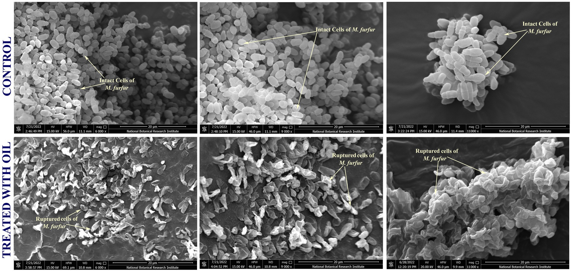The antagonistic effects of the most effective final formulation against M. furfur cells were visualized using scanning electron microscopy (SEM), following the procedure outlined by Mishra et al. (2018). Treated M. furfur cells (supplemented with formulated herbal oil) were harvested by centrifugation at 10000 rpm for 5 min. Subsequently, the treated cells were fixed with 2.5% (v/v) glutaraldehyde containing 0.1 M sodium cacodylate buffer, followed by the treatment of OsO4 (1%w/v) for 40 min. Thereafter, dehydration of the treated cells was achieved using increasing concentrations of ethanol (30–100%). The cells were dried using a critical point dryer and coated with gold–palladium using a sputter coater (Q150T ES, Quorum, East Sussex, UK). The treated cells were then visualized using a scanning electron microscope (eSEM-FEI Quanta 250). All experimental procedures were performed in triplicate.