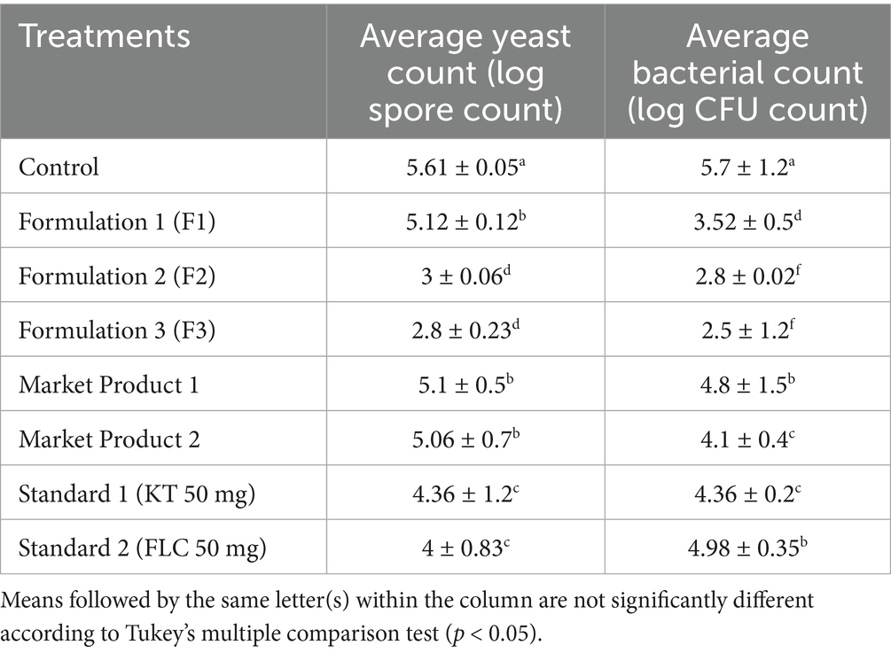 To further assess the antifungal efficacy of the formulations, average cell counts were determined following treatment. A non-treated spore suspension (500 μL) of standardized dandruff-causing microorganisms (M. furfur and S. epidermidis) was aseptically dispensed into 1 mL of freshly prepared SDB and NB (1 mL), supplemented with 100 μL of the different concentrations of the tested formulations (Formulation 1, 2 and 3), along with the respective control, standards, and market products (as per treatment) in culture tubes. Subsequently, the experimental setup was incubated at 30 ± 2 °C and 28 ± 2 °C for M. furfur and S. epidermidis, respectively. Furthermore, a 100 μL aliquot was sampled (after every 24 h) from each treatment for quantitative assessment. S. epidermidis growth under the different treatments was estimated by plating serial decimal dilutions (100 μL) on NA, followed by incubation at 28 ± 2 °C. The S. epidermidis colonies on NA plates were recorded to determine the average bacterial cell count (Korte et al., 2023). In addition, the average yeast cell count of M. furfur was determined using a hemocytometer (Sonderegger et al., 2018). All experiments were performed in triplicate, and the results were expressed as CFU mL−1 for S. epidermidis and cells mL−1 for M. furfur.