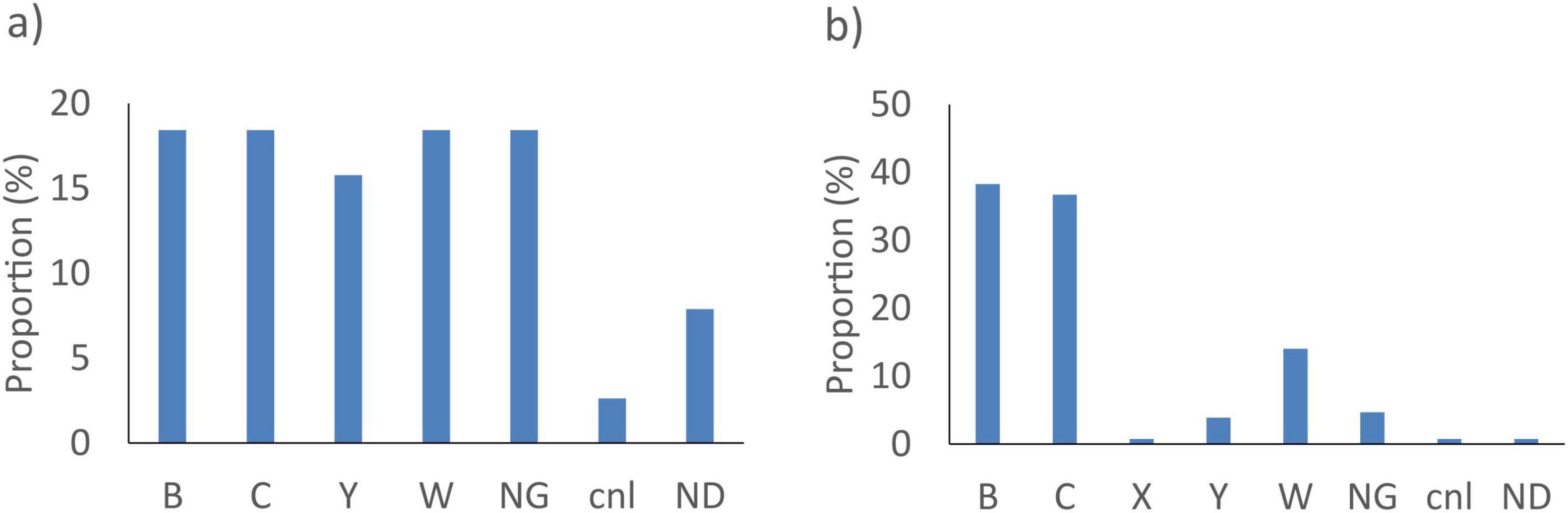 Figure 1. Proportion of genogroup of N. meningitis not detected by the best targets: (a) sodC and (b) porA in silico. NG, non-groupable; cnl, capsule null locus; ND, not determined.