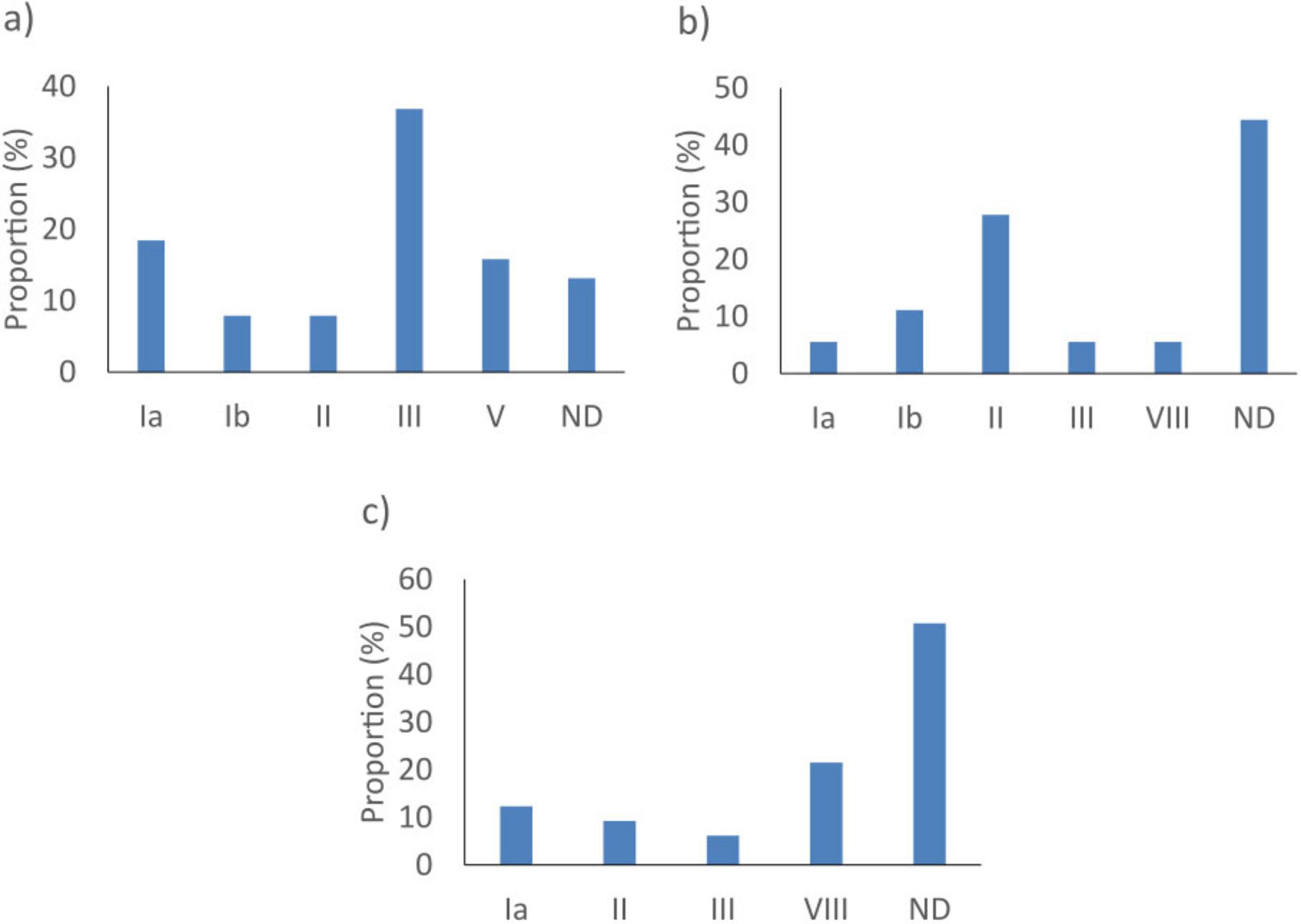 Figure 2. Proportion of serotypes of Streptococcus agalactiae not detected by the best targets: (a) sip, (b) dltS, and (c) cfb in silico. ND, not determined.