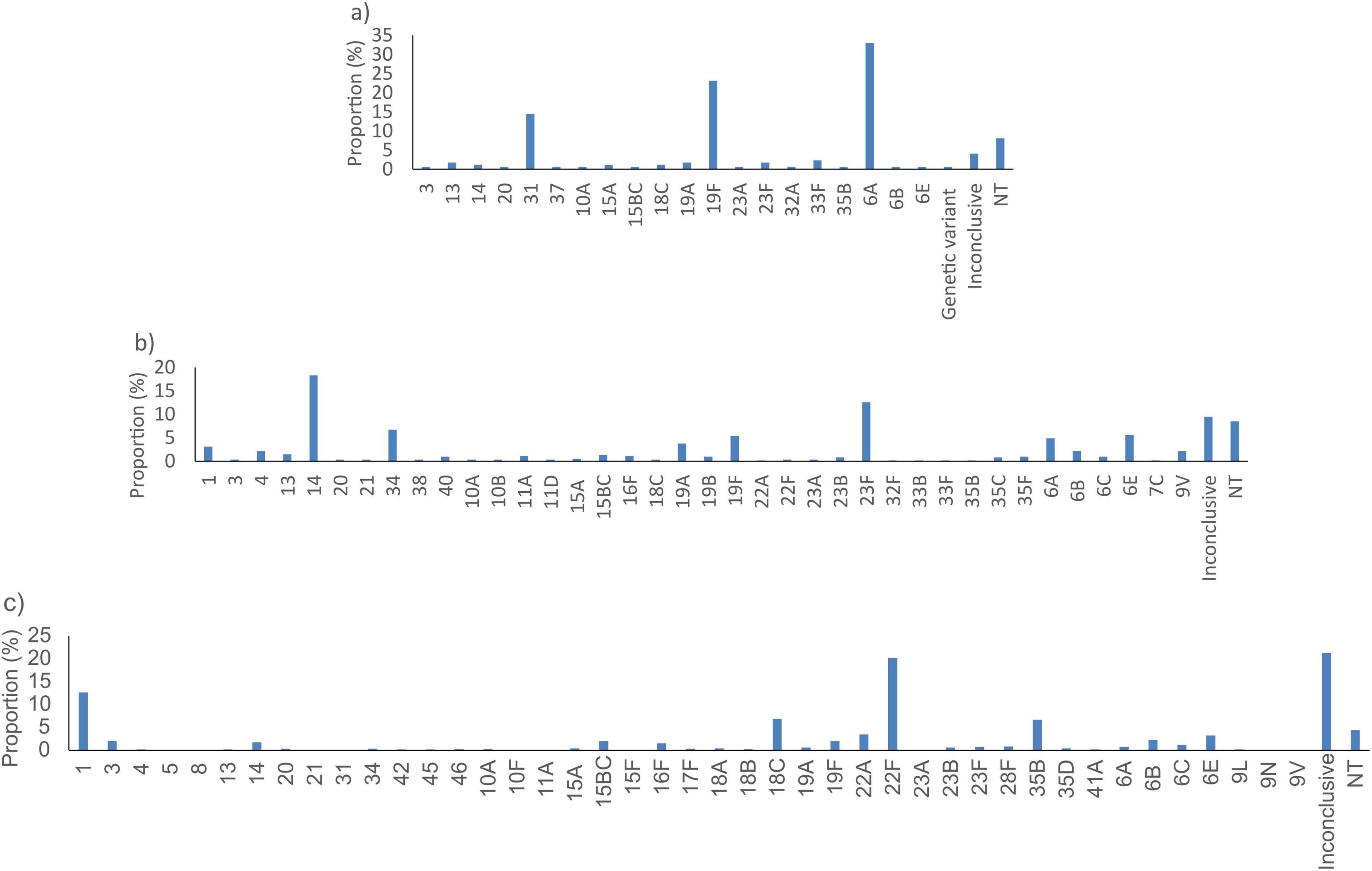 Figure 3. Proportion of serotypes of S. pneumoniae not detected by the best targets: (a) SP2020, (b) lytA, and (c) psaA in silico. NT, non-typeable.
