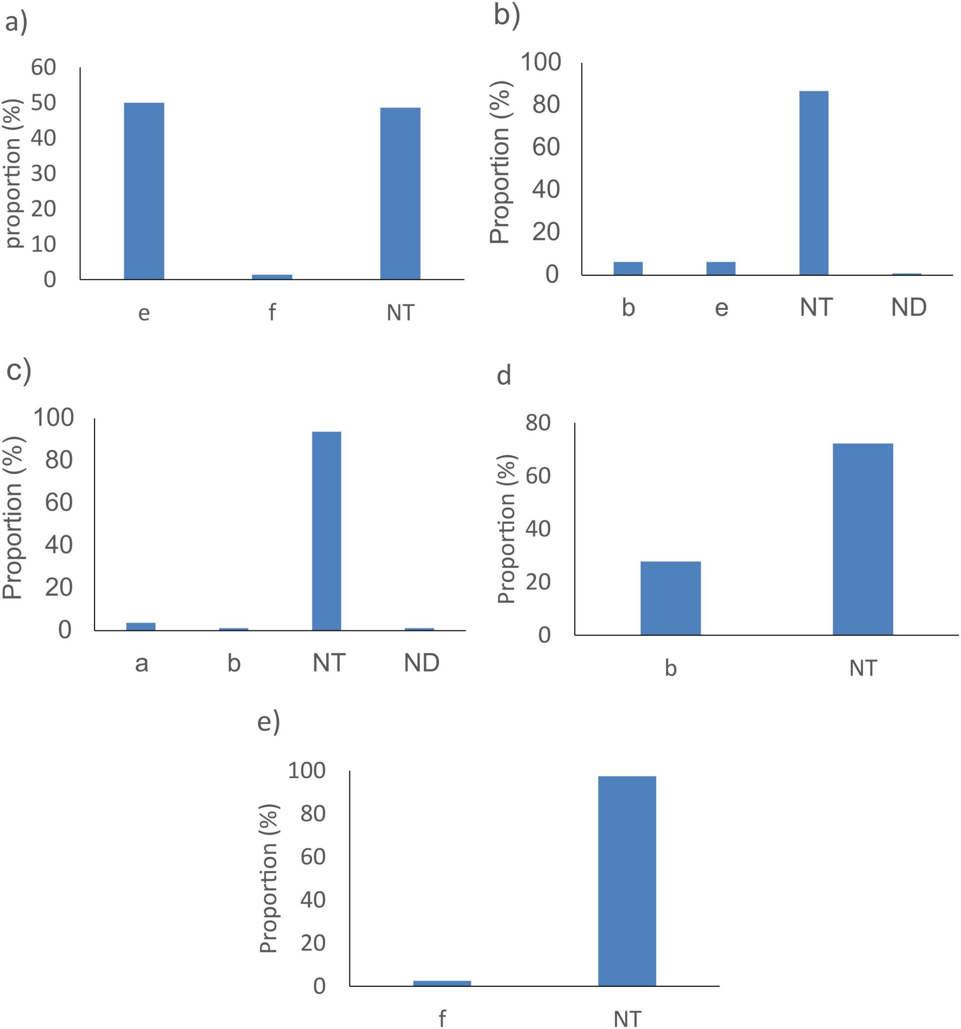 Figure 4. Proportion of serotypes of H. influenzae not detected by the best targets: (a) fucK, (b) hpd, (c) pstA, (d) HAEM0428, and (e) HAEM1183 in silico. NT, non-typeable, ND, not determined.