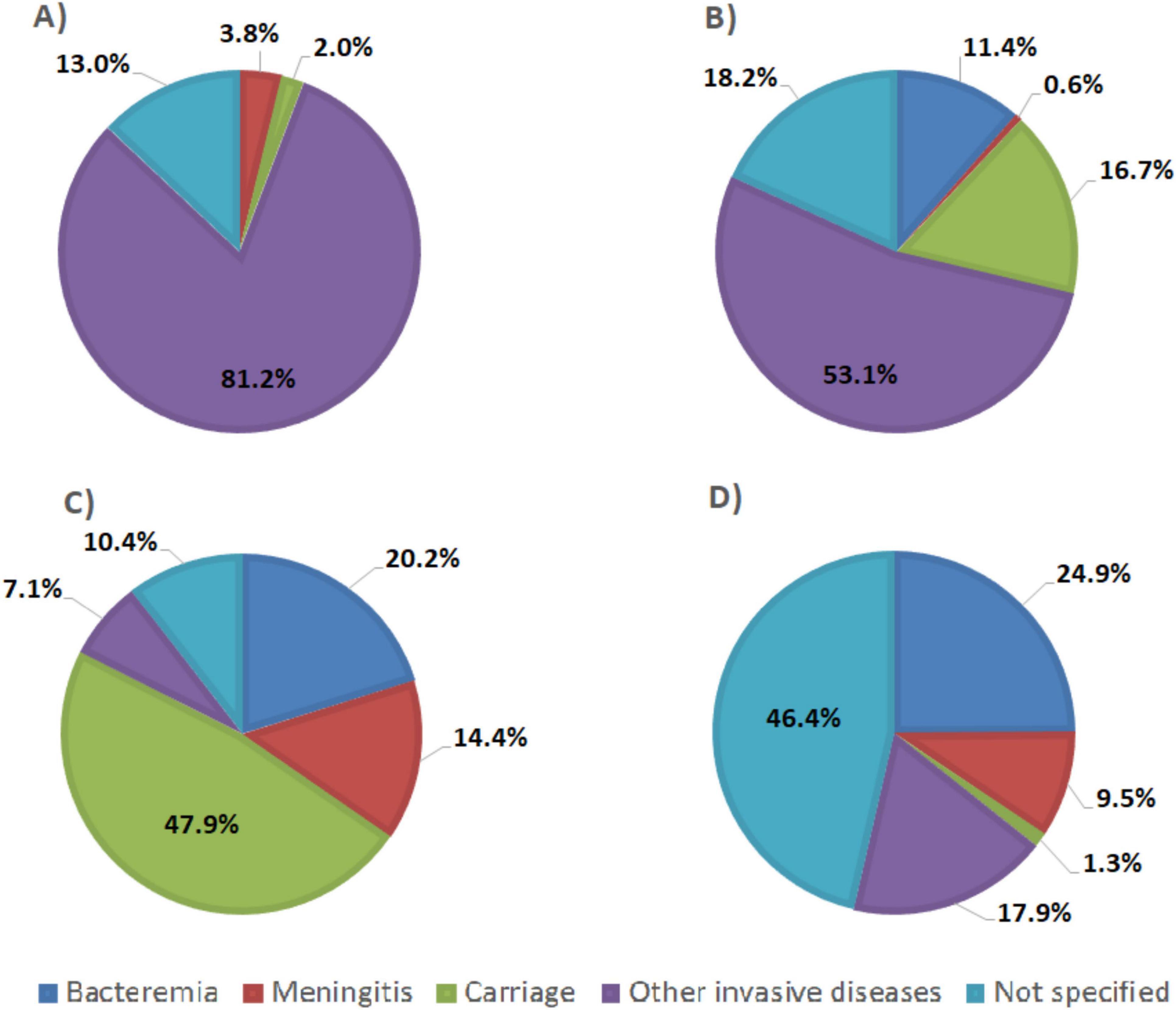 Figure 5. Pie chart representing clinical sources of genomic sequences of (A) N. meningitidis, (B) Streptococcus agalactiae, (C) S. pneumoniae, and (D) H. influenzae from PubMLST database.