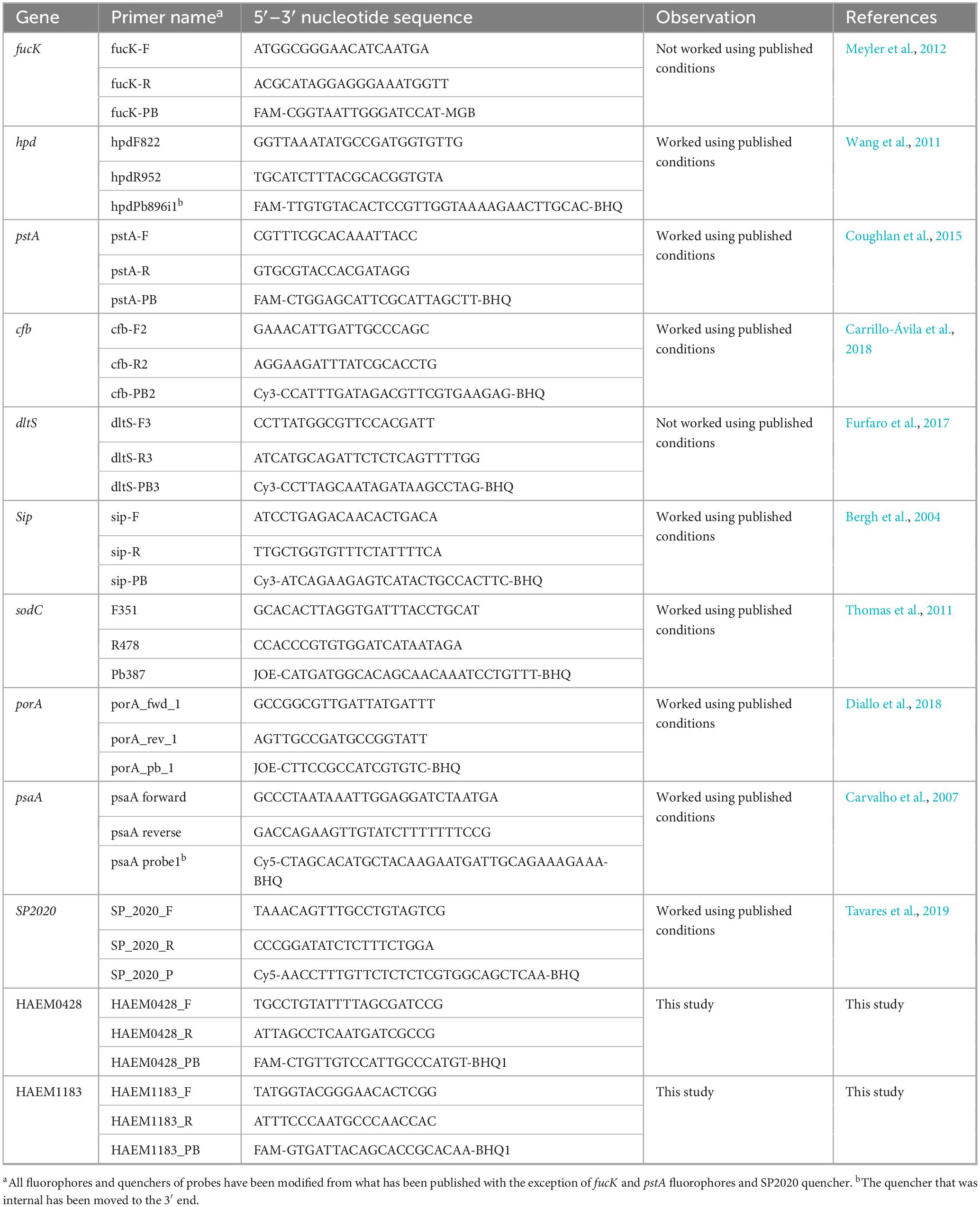 Real-time PCR amplifications were carried out targeting the two genetic determinants most prevalent in WGS and exhibiting the highest sensitivities and specificities with at least 95% identified in in silico analyses (top two best target genes). In cases where the PCR did not work, a third gene, was tested (Table 1). For H. influenzae, two additional high-scoring genes were also tested. Assays were performed on a CFX96 Touch™ Real-Time PCR Detection system (Bio-Rad) using the TaqMan® Gene Expression Master Mix (Applied Biosystems). The reaction mixture consisted of 7.5 μL of 2× Master Mix, 0.5 μM of each primer (forward and reverse), 0.5 μM of probe (Table 1), template DNA (2 μL) and UltraPure DNase/RNase-Free Distilled Water for a final volume of 15 μL. Positive controls and no-template control were included in each experiment. The cycling parameters consisted of 2 min at 50 °C, 10 min at 95 °C, 45 cycles of 95 °C for 15 s and 60 °C for 1 min, and then a holding stage at 4 °C. Samples with Ct values below 35 were considered positive, those above 40 negative, and values between 35 and 40 were classified as equivocal, unless otherwise specified. Equivocal samples were diluted 1:10 to reduce potential inhibitors and retested (Pouladfar et al., 2022).