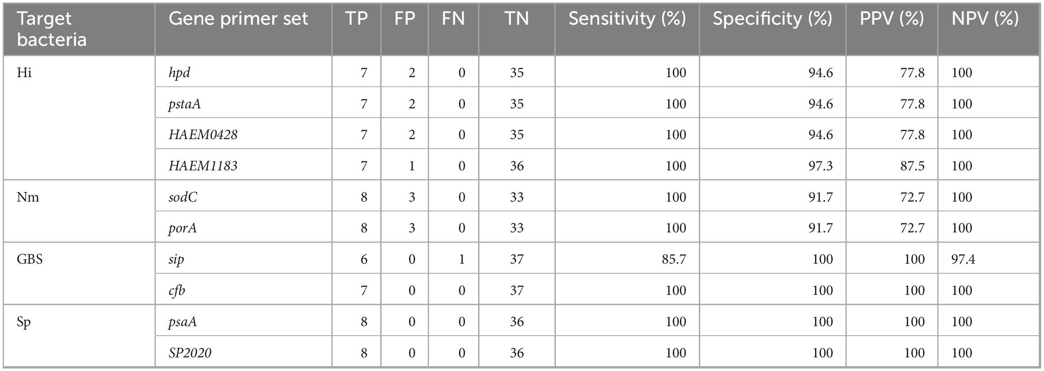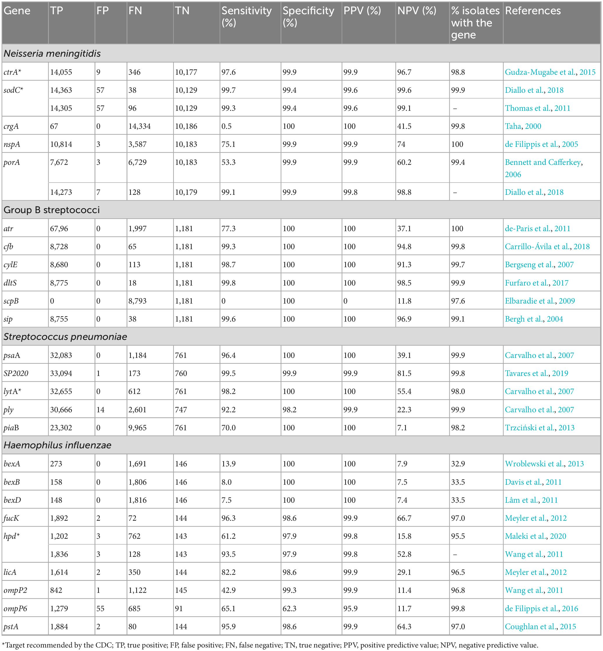 Results: The best performing in silico genetic determinants targeted: N. meningitidis, sodC (NEIS1339) (sensitivity 99.7%, specificity, 99.4%, PPV, 99.6% and NPV, 99.6%); S. pneumoniae, SP2020 (99.5%, 99.9%, 99.9%, and 81.5%) and H. influenzae, dmsA (HAEM1183) (98%, 100%, 99.6%, and 77.4%). All three of these targets also had the best in vitro sensitivity (100%), specificity [91.7% sodC (NEIS1339), 100% SP2020 and 97.3% dmsA (HAEM1183), PPV (72.7% sodC (NEIS1339), 100% SP2020 and 87.5% dmsA (HAEM1183)] and NPV (100% for all targets). The gene sip (SAG0032) encoding the surface immunogenic protein (sip) exhibited the best sensitivity (99.6%) and NPV (96.9%) for S. agalactiae compared to 99.3% and 94.8% for cfb (SAG2043), respectively in silico. However, in vitro, cfb showed the best sensitivity (100% vs. 85.7%) and NPV (100% vs. 97.4%) when compared to sip.