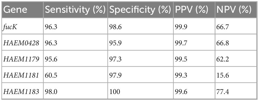 The gene, fucK, one of the top in silico H. influenzae genetic determinants did not work using the reaction conditions described in the original paper (Meyler et al., 2012). This target was therefore not considered further. The remaining targets, hpd, pstA, HAEM0428 and HAEM1183, showed a sensitivity of 100% and a NPV of 100% each. The specificity of HAEM1183 was 97.3%, hpd, pstA and HAEM0428 were identical (94.6%). PPV was 87.5% for HAEM1183, 77.8% for hpd, pstA and HAEM0428 (Table 5 and Supplementary Table 4).