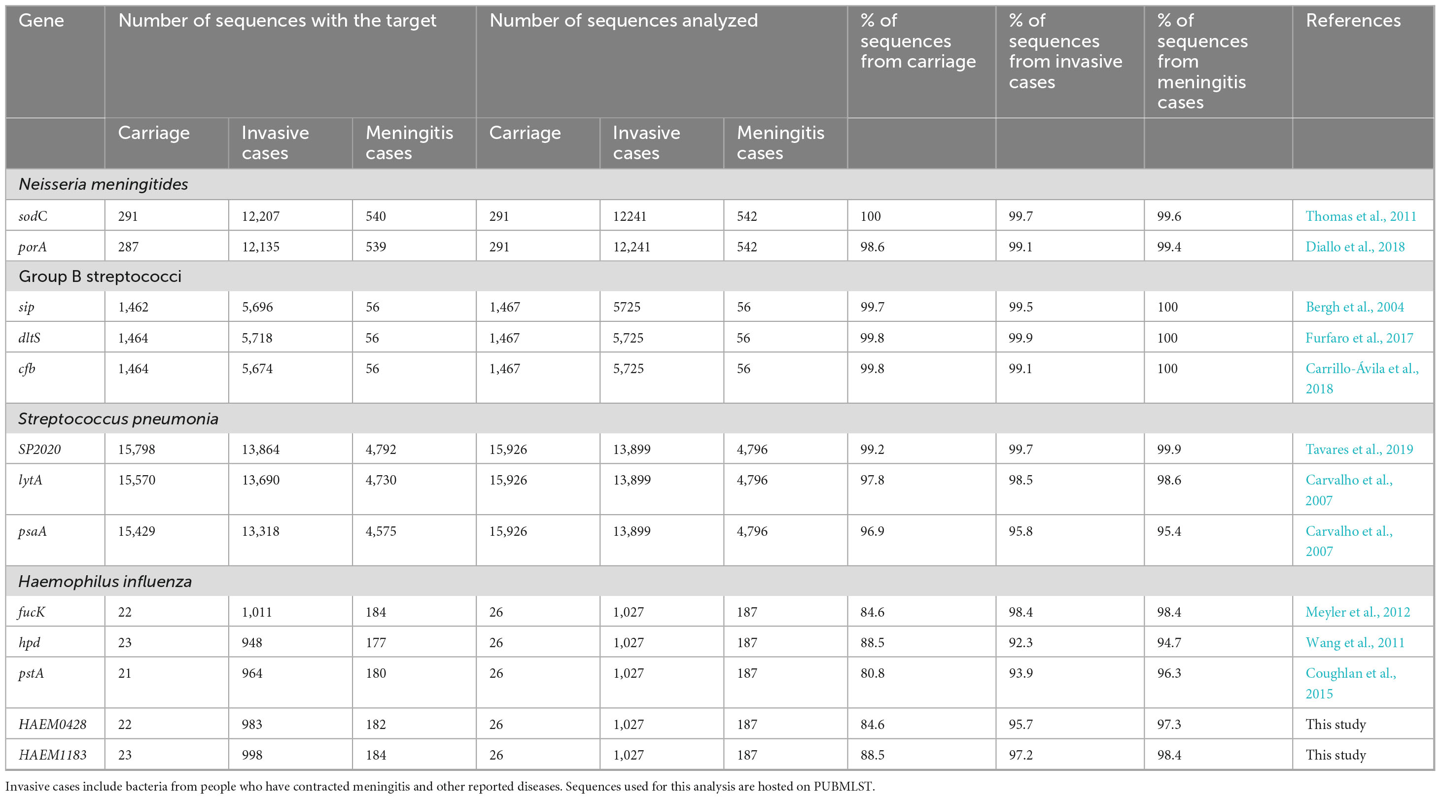 A narrative review identified 25 genetic targets used in the detection of H. influenzae, N. meningitidis, S. pneumoniae, and S. agalactiae (Diallo et al., 2021). Testing these targets in vitro is costly and time-consuming. An alternative is to identify suitable targets in silico through bioinformatic analyses using large genome datasets and then confirming their appropriateness in vitro using a reduced panel of bacterial isolates (van Weezep et al., 2019).