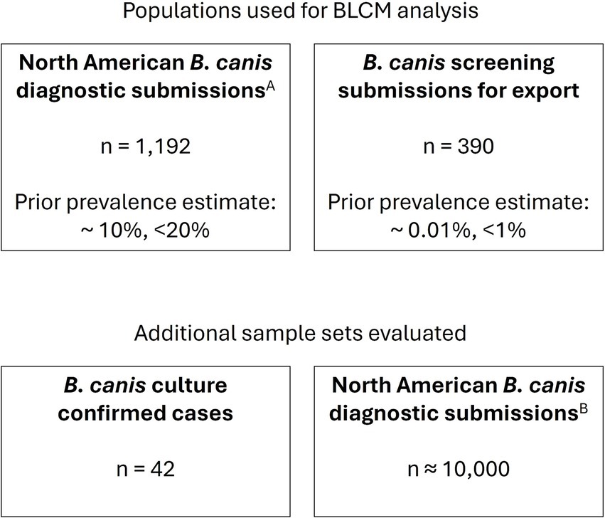 Diagram of populations used for BLCM analysis. Top: North American B. canis diagnostic submissions (n = 1,192) with a prior prevalence estimate of about ten percent, less than twenty percent, and B. canis screening submissions for export (n = 390) with a prior prevalence estimate of about 0.01 percent, less than one percent. Bottom: Additional sample sets include B. canis culture confirmed cases (n = 42) and North American B. canis diagnostic submissions (n approximately 10,000).