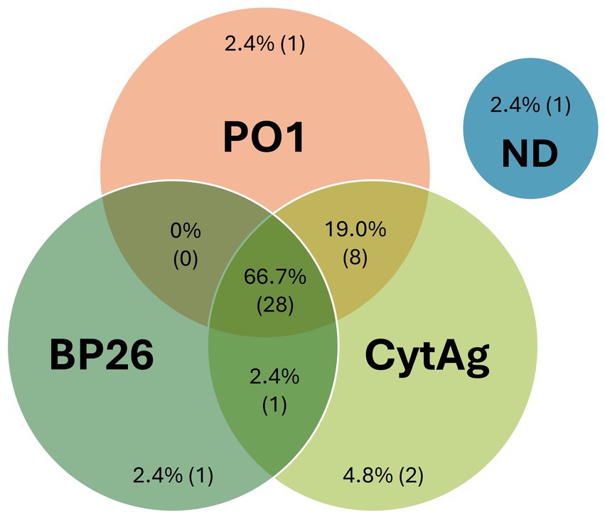 Venn diagram with three overlapping circles labeled PO1, BP26, and CytAg. PO1, in orange, overlaps with BP26 and CytAg, showing a shared value of sixty-six point seven percent (28). PO1 and CytAg share nineteen percent (8). Each circle also contains individual percentages: BP26 has zero percent (0) alone, CytAg has four point eight percent (2) alone, and PO1 contains two point four percent (1). An additional circle labeled ND appears separately with two point four percent (1). ND, Not Detected.