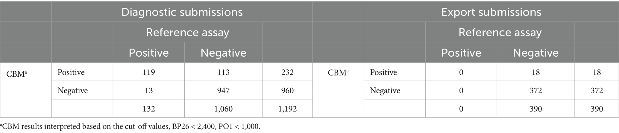 The sensitivity and specificity estimations for both the two-antigen CBM assay and the reference assay at the cut-off values of BP26 < 2,400, PO1 < 1,000 is presented in Table 3. The sensitivity of the two-antigen CBM assay was estimated to be 91.6% (95% CI, 85.2–98.0%), which was substantially greater than the estimated sensitivity of the reference assay, estimated to be 66.1% (95% CI, 55.2–81.7%) (Table 3). The specificity of the two-antigen CBM assay was estimated to be 94.9% (95% CI, 92.3–96.9%), slightly lower than the estimated specificity of the reference assay 99.8% (95% CI, 99.0–100.0%). Estimated seroprevalence was determined to be 0.1% (95% CI, 0.0–0.6%) for the export sample submissions, and 16.1% (12.6–19.3%) for the routine diagnostic submissions.