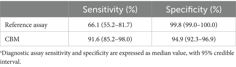 Given that the serological reference assay is not a true “gold standard” for diagnosis of B. canis infection, we employed a BLCM analysis to estimate the accuracy of the two-antigen CBM assay. This method allows for the estimation of the sensitivity and specificity of both the test under evaluation as well as the reference assay and estimates the seroprevalence of each population included in the model.