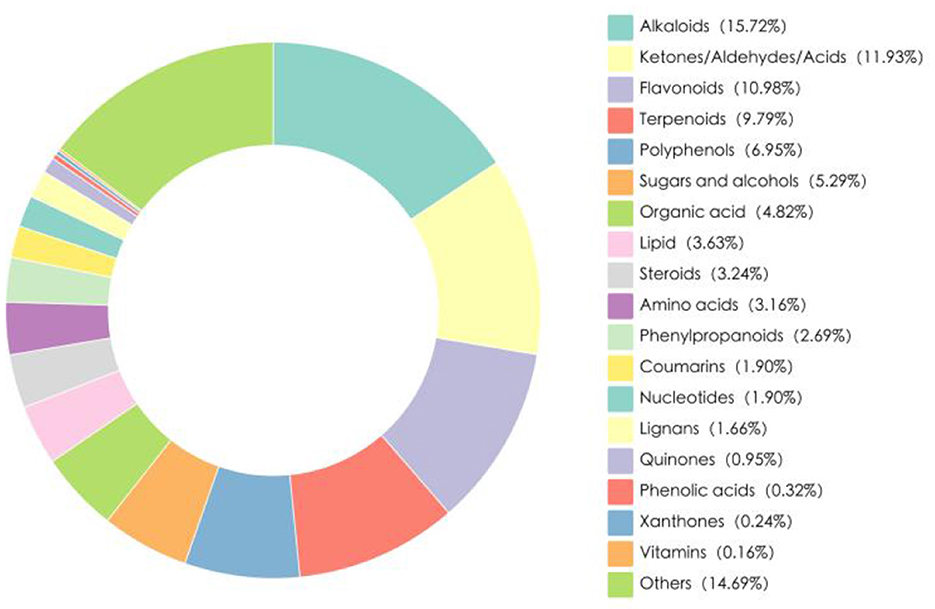 The hydroponic wheat seedlings (HWS) used in this research were provided by Xinjiang Kemite Agricultural Technology Co., Ltd. (China). They were germinated from red wheat seeds (Triticum aestivum L.) in fully automated containerized cultivation chambers over a 7-day period, Fresh HWS batches were delivered daily to the experimental site, with their nutritional composition shown in Table 1. Bioactive compounds in HWS were analyzed by Biomarker Technologies Corporation (Beijing, China) using liquid chromatography-mass spectrometry (LC-MS), which identified 1266 distinct bioactive substances categorized into 19 classes (Figure 1). Alkaloids constituted the largest proportion (15.72%), followed by keto-aldehydic acids (11.93%), flavonoids (10.98%), terpenoids (9.79%), and polyphenols (6.95%).