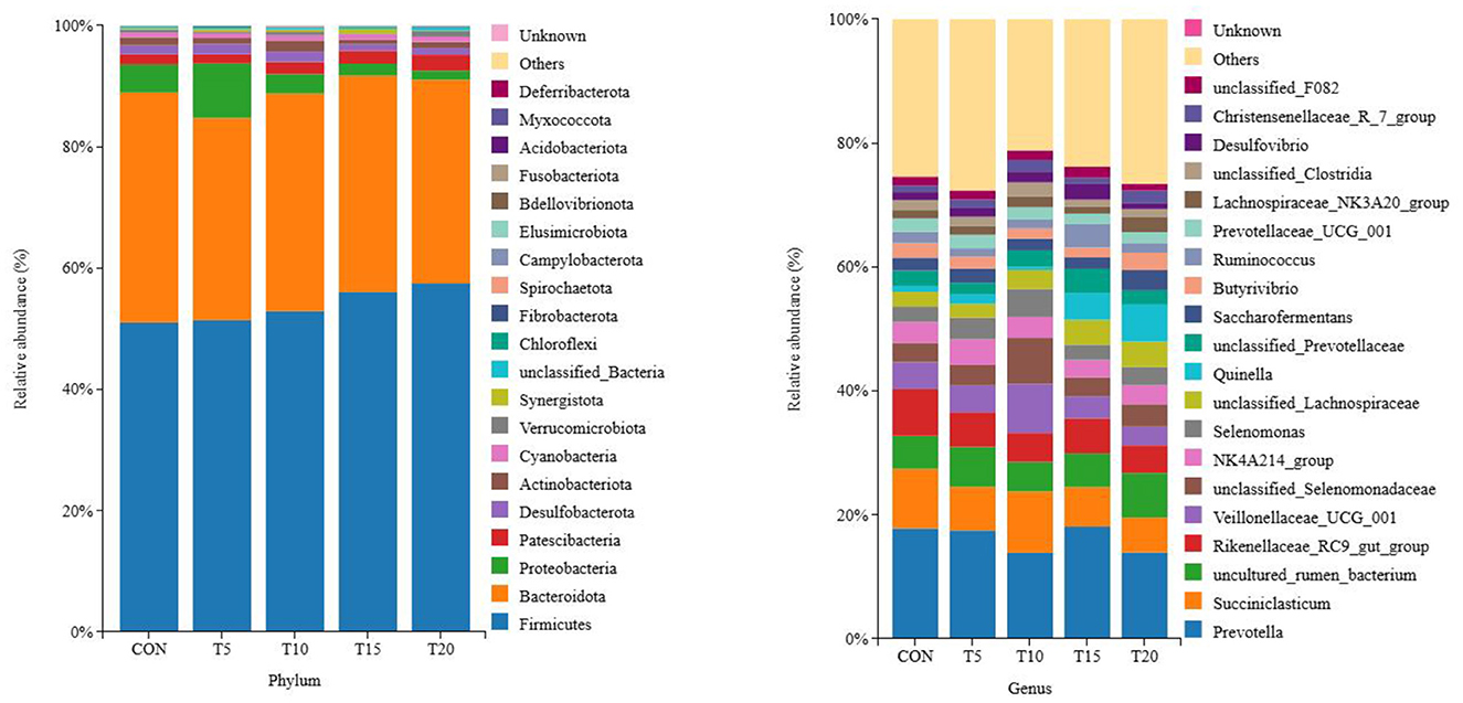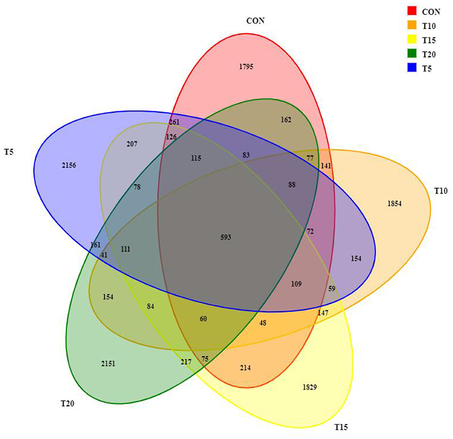 Rumen fluid sequencing revealed >99% coverage across all samples. A total of 1,970,786 paired-end reads were obtained from 25 samples, yielding 1,962,740 clean reads after quality filtering, with each sample generating ≥50,537 clean reads (mean: 78,510 reads/sample). Sequences were clustered at 97% similarity, identifying 13,422 operational taxonomic units (OTUs) (Figure 2). Among these, 593 OTUs were shared across all groups, while CON, T5, T10, T15, and T20 harbored 1,795, 2,156, 1,854, 1,829, and 2,151 unique OTUs, respectively, with CON exhibiting the lowest OTU.