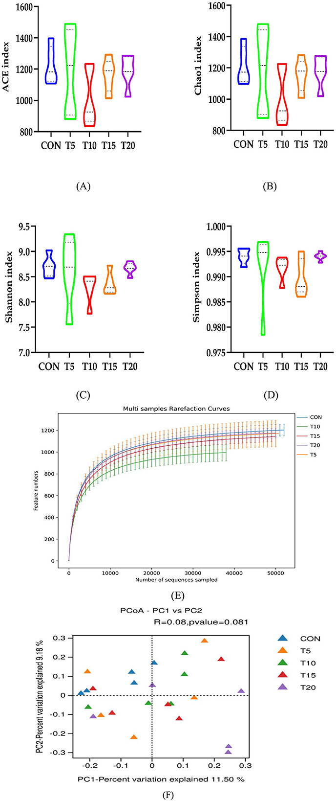 Figure 4. Diversity, abundance, dilution curves and PCoA plots. Figure 4 compares the control group (CON) with treatment groups (T5, T10, T15, T20) through multiple datasets. (A–D) Illustrate the variation trends of four different indices (ACE index, Chao1 index, Shannon index, and Simpson index) across the groups. (E, F) Depict the distribution of feature numbers for all groups, with both panels sharing the same axis labels and value ranges.