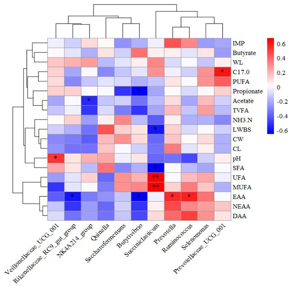 Figure 5. Heatmap showing the relationships among relative microbial abundance, rumen fermentation parameters, and meat quality. IMP, Inosine monophosphate; WL, Water loss rate; C17.0, C17:0; NH3.N, NH3-N; LWBS, Live weight before slaughter; CW, Carcass weight; CL, Cooked meat percentage.*P < 0.05 **P < 0.01.