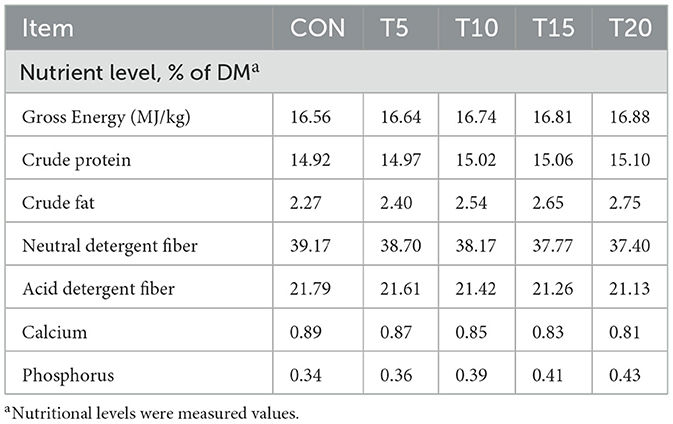During the trial period, HWS and feed samples from each group were collected every 7 days. After the trial concluded, 500 g of each sample was divided into four portions using the quartering method for −20 °C preservation. Moisture content (Method 950.46), ether extract (Method 960.39), crude protein (Method 928.08), crude ash (Method 920.153), total energy (Method 942.05), calcium (Method 968.08), and total phosphorus levels (Method 965.17) were measured according to AOAC methods (Latimer, 2023). Neutral detergent fiber and acid detergent fiber percentages were determined using the methodologies described by (Van Soest et al. 1991).