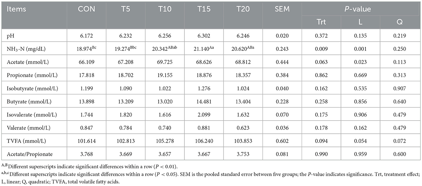 As shown in Table 4, ruminal NH3-N concentration exhibited a linear increase (P < 0.01) with escalating HWS inclusion levels. The T15 group demonstrated a significant elevation (P < 0.01) in NH3-N concentration compared to (CON), while T10 and T20 groups showed significant increases (P < 0.05). Notably, T15 and T20 exceeded T5 in NH3-N concentration (P < 0.05). Both ruminal NH3-N and acetate concentrations displayed linear upward trends (P < 0.05) with incremental HWS supplementation.