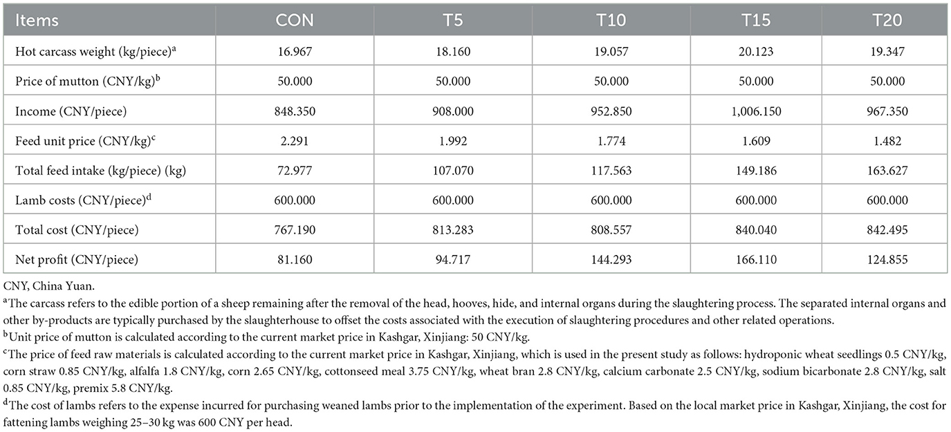 HWS' nutritional favorability and cost-effectiveness as a partial substitute in the basal diet reduced feed cost per kg and enhanced utilization efficiency, thereby lowering production expenses. Table 6 illustrates the economic impact of dietary HWS substitution ion meat sheep production. Based on market prices in Kashgar, Xinjiang, China, replacing 5–20% of basal feed with HWS significantly decreased feed cost per kilogram. The net profits from all HWS groups exceeded those of the CON, but T15 achieved the highest profitability.