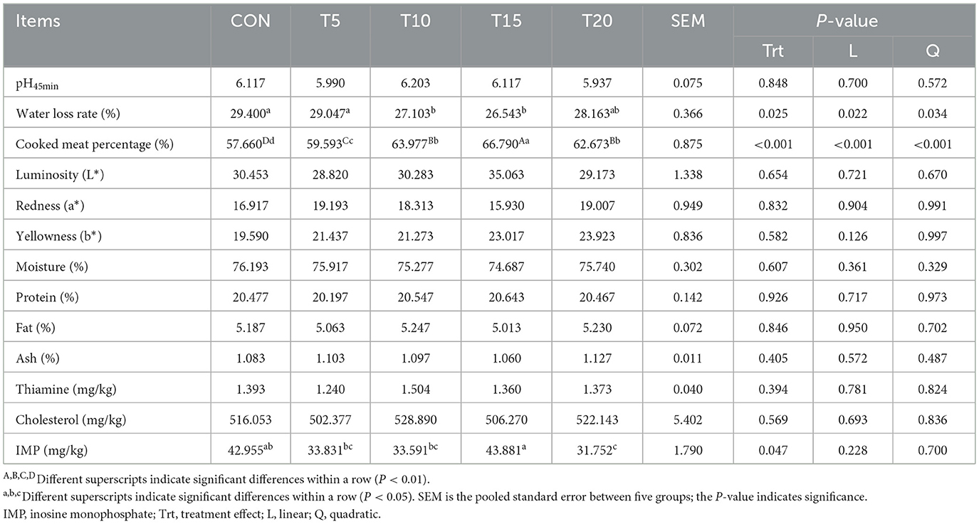 The pH45min value of carcass muscle was measured using a portable pH meter (Shanghai Yidian Scientific Instrument Co., Ltd., Shanghai, China) after calibration with standard buffer solutions. Meat color parameters: (L* = lightness, a* = redness, and b* = yellowness) were determined under light-protected conditions using a portable chroma meter (Hangzhou Caipu Technology Co., Ltd., Zhejiang, China). For water loss measurements, 1 cm thick longissimus dorsi muscle samples were excised perpendicular to the muscle fiber orientation and cored with a 3 cm diameter circular sampler (DL-100; Sumspring Sanquan Zhongshi, Shandong, China). The samples were compressed between six layers of filter paper under 35 kg pressure for 5 min, with water loss percentage calculated from pre- and post-compression weights. Cooked meat percentage was determined by sealing meat specimens (3 cm × 3 cm × 5 cm) in plastic bags, placing them in a water-bath heated at 85 °C for 40 min, cooled to ambient temperature, blotted dry, and calculated using: W1 = pre-cooking weight (g) and W2 = post-cooking weight (g). The core formula is: Cooked meat percentage (%) = (W2/W1) × 100% (Ren et al., 2023).