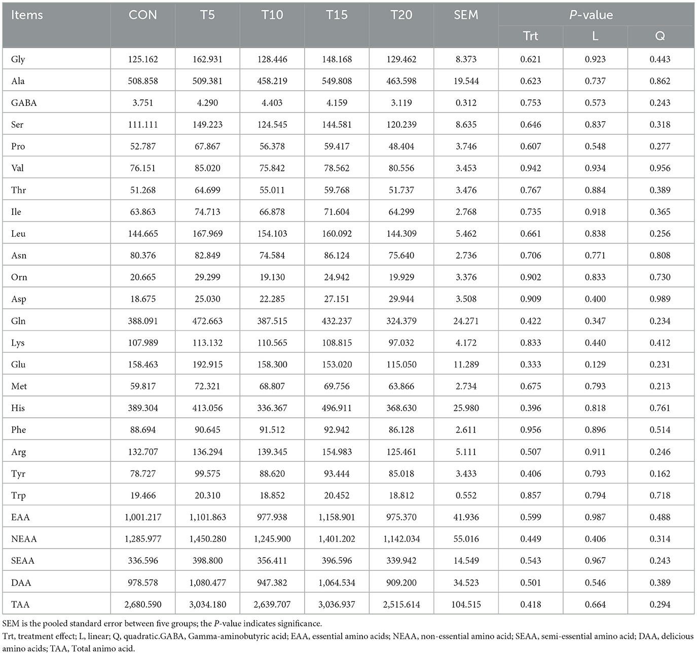 Table 8 delineates the effects of HWS on amino acid profiles in ovine longissimus dorsi muscle. Ala, Gln, and His were the predominant contributors to the total amino acid composition. Increasing HWS inclusion resulted in numerical increases in Gly, Ser, Thr, Ile, Asp, Met, and Tyr across all treatment groups (P > 0.05). The T5 and T15 groups exhibited higher essential amino acids (EAAs), non-essential amino acids (NEAAs), dibasic amino acids like lysine, arginine and histidine (DAAs), and total amino acids (TAAs) compared with the CON, but no intergroup differences reached statistical significance (P > 0.05).