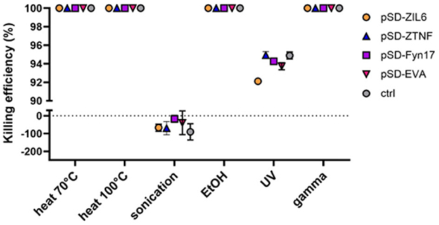 Figure 1. Killing efficiency of different physicochemical treatments on recombinant L. lactis strains displaying different binders of proinflammatory cytokines on their surface. The killing efficiency was determined by culturing and counting colonies on agar plates. Complete killing of bacteria i.e., 0 CFU/mL (no bacterial colonies on agar plates) was considered as 100% efficiency. pSD-ZIL6, L. lactis displaying anti-IL6 affibody; pSD-ZTNF, L. lactis displaying anti-TNF affibody; pSD-Fyn17, L. lactis displaying anti-IL17 fynomer; pSD-EVA, L. lactis displaying anti-IL8 evasin; pNZ8148, L. lactis harboring empty plasmid. The results presented are means ± standard deviation (SD) of three technical replicates from a representative experiment.