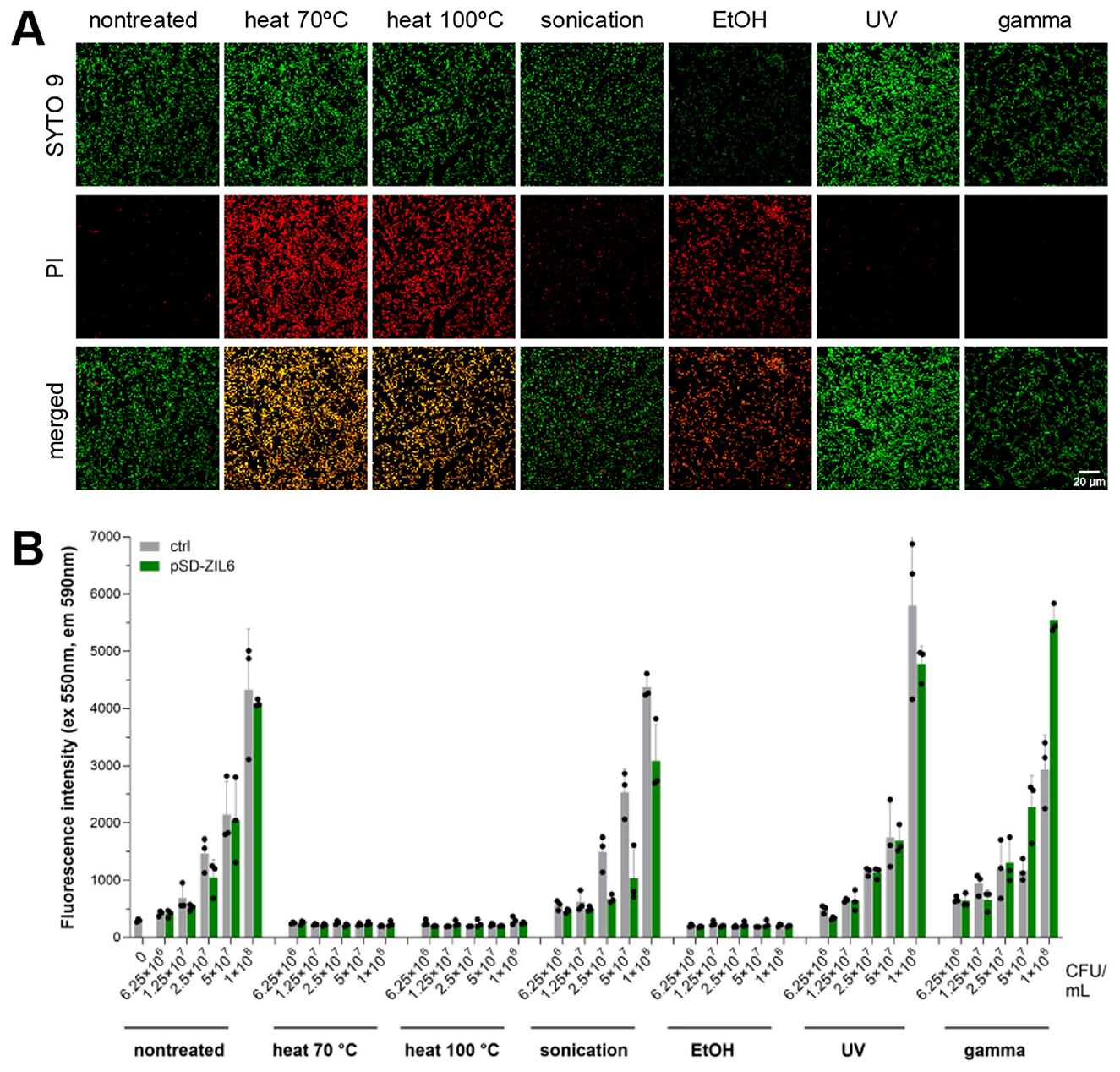 Figure 3. (A) Cell membrane integrity of ZIL6-displaying L. lactis bacteria upon treatments. Fluorescent microscopy images of SYTO 9 and PI stained ZIL6-displaying L. lactis before and after treatment with heat (70 °C, 40 min or 100 °C, 30 min), sonication, ethanol, UV, and gamma irradiation. In the merged images, the cells with intact membranes are stained green (SYTO 9+PI−), the cells with damaged membranes are stained red (SYTO 9−PI+), whereas the cells with a partially disrupted membrane are stained orange (SYTO 9+PI+). (B) Metabolic activity of recombinant L. lactis bacteria upon treatments. Resazurin assay of ZIL6-displaying L. lactis before and after each treatment. Data represents the mean ± SD of three technical replicates of a representative experiment. pSD-ZIL6, L. lactis displaying ZIL6 affibody; Ctrl: L. lactis control cells containing empty plasmid pNZ8148.