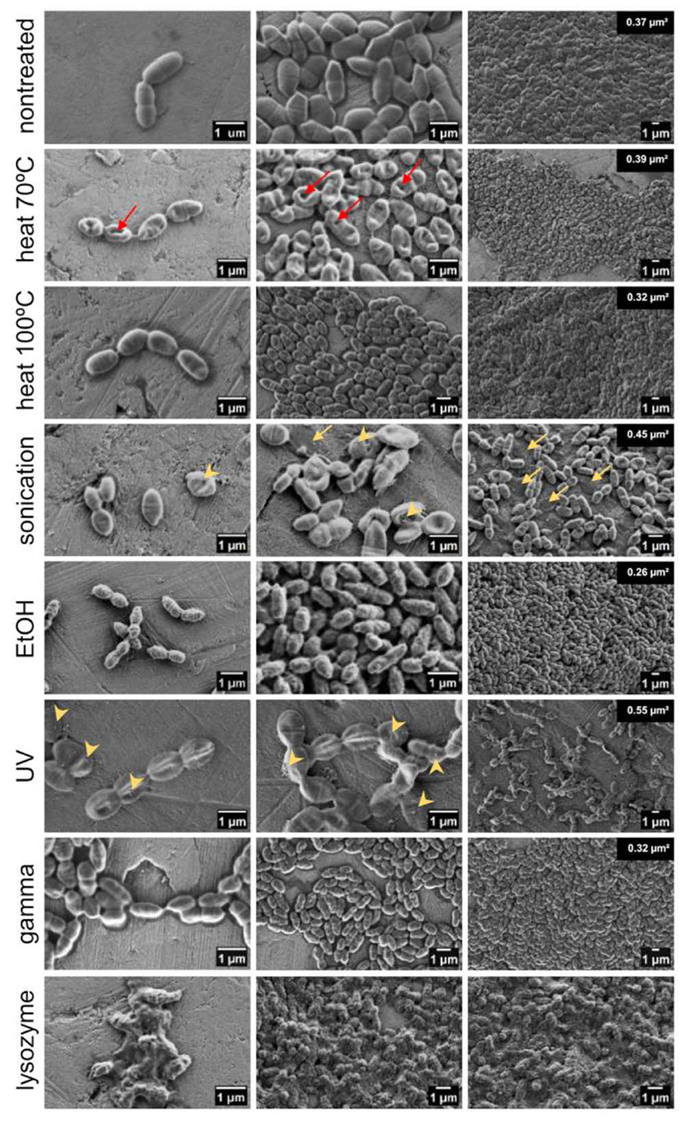 Figure 4. Morphology and surface structure of ZIL6-displaying L. lactis bacteria before and after treatments. Representative scanning electron micrographs of non-treated L. lactis cells compared to the bacteria exposed to heat (70 °C, 40 min or 100 °C, 30 min), sonication, ethanol, UV, gamma irradiation, and lysozyme/mutanolysin treatment. Bacterial samples were air dried from the water suspension (image depicts the cells under high, medium and low magnification). Red arrows indicate dents in the surface of the cells subjected to heat at 70 °C, while the yellow arrows indicate deflated cells after sonication. The extracellular surface structures on sonicated and UV-treated bacteria are marked by yellow arrowheads. The numbers on the top right of the rightmost images indicate the average bacterial cell area quantified using ImageJ.